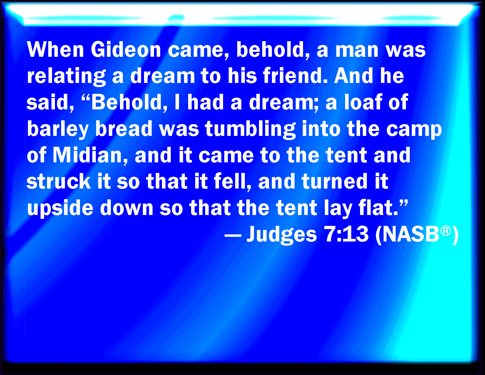 Bible Verse Slide Judges 7:13 And when Gideon was come, behold, there was a man that told a dream to his fellow, and said, Behold, I dreamed a dream, and, see, a cake of barley bread tumbled into the host of Midian, and came to a tent, and smote it that it fell, and overturned it, that the tent lay along. KJV: And when Gideon was come, behold, there was a man that told a dream unto his fellow, and said, Behold, I dreamed a dream, and, lo, a cake of barley bread tumbled into the host of Midian, and came unto a tent, and smote it that it fell, and overturned it, that the tent lay along. DRB: And when Gedeon was come, one told his neighbour a dream: and in this manner related what he had seen: I dreamt a dream, and it seemed to me as if a hearth cake of barley bread rolled and came down into the camp of Madian: and when it was come to a tent it struck it, and beat it down flat to the ground. DBT: When Gideon came, behold, a man was telling a dream to his comrade; and he said, "Behold, I dreamed a dream; and lo, a cake of barley bread tumbled into the camp of Mid'ian, and came to the tent, and struck it so that it fell, and turned it upside down, so that the tent lay flat." ERV: And when Gideon was come, behold, there was a man that told a dream unto his fellow, and said, Behold, I dreamed a dream, and, lo, a cake of barley bread tumbled into the camp of Midian, and came unto the tent, and smote it that it fell, and turned it upside down, that the tent lay along. WBT: And when Gideon had come, behold, there was a man that told a dream to his fellow, and said, Behold, I dreamed a dream, and lo, a cake of barley-bread rolled into the host of Midian, and came to a tent, and smote it that it fell, and overturned it that the tent lay along. WEB: When Gideon had come, behold, there was a man telling a dream to his fellow; and he said, "Behold, I dreamed a dream; and behold, a cake of barley bread tumbled into the camp of Midian, and came to the tent, and struck it so that it fell, and turned it upside down, so that the tent lay flat." YLT: And Gideon cometh in, and lo, a man is recounting to his companion a dream, and saith, 'Lo, a dream I have dreamed, and lo, a cake of barley-bread is turning itself over into the camp of Midian, and it cometh in unto the tent, and smiteth it, and it falleth, and turneth it upwards, and the tent hath fallen.'Links Judges 7:13 NIV • Judges 7:13 NLT • Judges 7:13 ESV • Judges 7:13 NASB • Judges 7:13 KJV • Judges 7:13 Interlinear • Judges 7:13 Commentaries • Judges 7:13 Parallel Texts • Judges 7:13 Bible Apps • Judges 7:13 Parallel • Bible Hub |