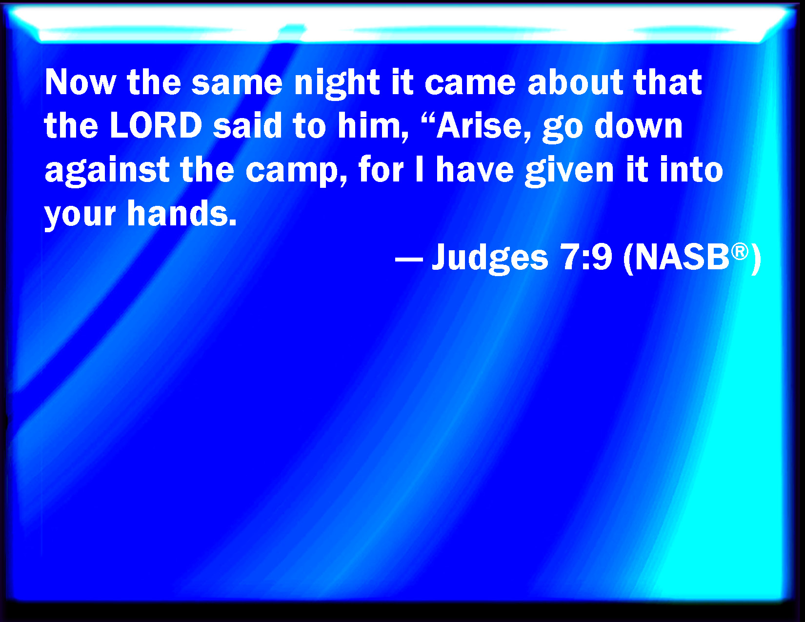 Bible Verse Slide Judges 7:9 And it came to pass the same night, that the LORD said to him, Arise, get you down to the host; for I have delivered it into your hand. KJV: And it came to pass the same night, that the LORD said unto him, Arise, get thee down unto the host; for I have delivered it into thine hand. DRB: The same night the Lord said to him: Arise, and go down into the camp: because I have delivered them into thy hand. DBT: That same night the LORD said to him, "Arise, go down against the camp; for I have given it into your hand. ERV: And it came to pass the same night, that the LORD said unto him, Arise, get thee down into the camp; for I have delivered it into thine hand. WBT: And it came to pass the same night, that the LORD said to him, Arise, go down to the host; for I have delivered it into thy hand. WEB: It happened the same night, that Yahweh said to him, "Arise, go down into the camp; for I have delivered it into your hand. YLT: And it cometh to pass, on that night, that Jehovah saith unto him, 'Rise, go down into the camp, for I have given it into thy hand;Links Judges 7:9 NIV • Judges 7:9 NLT • Judges 7:9 ESV • Judges 7:9 NASB • Judges 7:9 KJV • Judges 7:9 Interlinear • Judges 7:9 Commentaries • Judges 7:9 Parallel Texts • Judges 7:9 Bible Apps • Judges 7:9 Parallel • Bible Hub |