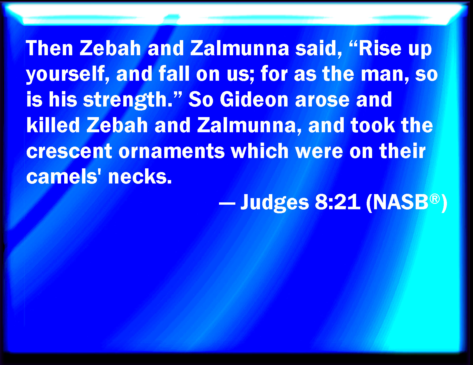 Bible Verse Slide Judges 8:21 Then Zebah and Zalmunna said, Rise you, and fall on us: for as the man is, so is his strength. And Gideon arose, and slew Zebah and Zalmunna, and took away the ornaments that were on their camels' necks. KJV: Then Zebah and Zalmunna said, Rise thou, and fall upon us: for as the man is, so is his strength. And Gideon arose, and slew Zebah and Zalmunna, and took away the ornaments that were on their camels' necks. DRB: And Zebee and Salmana said: Do thou rise, and run upon us: because the strength of a man is according to his age: Gedeon rose up and slew Zebee and Salmana: and he took the ornaments and bosses, with which the necks of the camels of kings are wont to be adorned. DBT: Then Zebah and Zalmun'na said, "Rise yourself, and fall upon us; for as the man is, so is his strength." And Gideon arose and slew Zebah and Zalmun'na; and he took the crescents that were on the necks of their camels. ERV: Then Zebah and Zalmunna said, Rise thou, and fall upon us: for as the man is, so is his strength. And Gideon arose, and slew Zebah and Zalmunna, and took the crescents that were on their camels' necks. WBT: Then Zebah and Zalmunna said, Rise thou, and fall upon us: for as the man is, so is his strength. And Gideon arose, and slew Zebah and Zalmunna, and took away the ornaments that were on their camels' necks. WEB: Then Zebah and Zalmunna said, "Rise and fall on us; for as the man is, so is his strength." Gideon arose, and killed Zebah and Zalmunna, and took the crescents that were on their camels' necks. YLT: And Zebah saith — also Zalmunna — 'Rise thou, and fall upon us; for as the man — his might;' and Gideon riseth, and slayeth Zebah and Zalmunna, and taketh their round ornaments which are on the necks of their camels.Links Judges 8:21 NIV • Judges 8:21 NLT • Judges 8:21 ESV • Judges 8:21 NASB • Judges 8:21 KJV • Judges 8:21 Interlinear • Judges 8:21 Commentaries • Judges 8:21 Parallel Texts • Judges 8:21 Bible Apps • Judges 8:21 Parallel • Bible Hub |