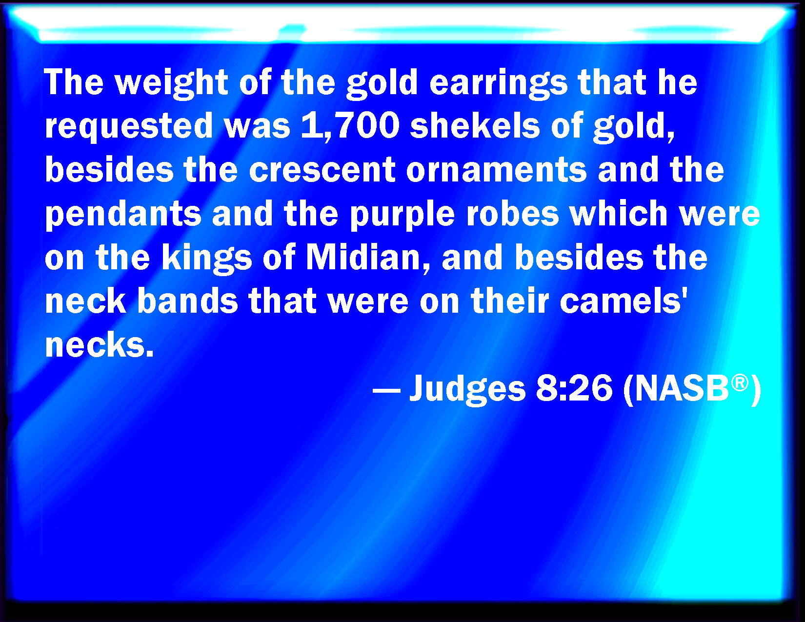 Bible Verse Slide Judges 8:26 And the weight of the golden earrings that he requested was a thousand and seven hundred shekels of gold; beside ornaments, and collars, and purple raiment that was on the kings of Midian, and beside the chains that were about their camels' necks. KJV: And the weight of the golden earrings that he requested was a thousand and seven hundred shekels of gold; beside ornaments, and collars, and purple raiment that was on the kings of Midian, and beside the chains that were about their camels' necks. DRB: And the weight of the earlets that he requested, was a thousand seven hundred sicles of gold, besides the ornaments, and jewels, and purple raiment which the kings of Madian were went to use, and besides the golden chains that were about the camels' necks. DBT: And the weight of the golden earrings that he requested was one thousand seven hundred shekels of gold; besides the crescents and the pendants and the purple garments worn by the kings of Mid'ian, and besides the collars that were about the necks of their camels. ERV: And the weight of the golden earrings that he requested was a thousand and seven hundred shekels of gold; beside the crescents, and the pendants, and the purple raiment that was on the kings of Midian, and beside the chains that were about their camels' necks. WBT: And the weight of the golden ear-rings that he requested, was a thousand and seven hundred shekels of gold; besides ornaments, and collars, and purple raiment that was on the kings of Midian, and besides the chains that were about their camels' necks. WEB: The weight of the golden earrings that he requested was one thousand and seven hundred [shekels] of gold, besides the crescents, and the pendants, and the purple clothing that was on the kings of Midian, and besides the chains that were about their camels' necks. YLT: and the weight of the rings of gold which he asked is a thousand and seven hundred shekels of gold, apart from the round ornaments, and the drops, and the purple garments, which are on the kings of Midian, and apart from the chains which are on the necks of their camels,Links Judges 8:26 NIV • Judges 8:26 NLT • Judges 8:26 ESV • Judges 8:26 NASB • Judges 8:26 KJV • Judges 8:26 Interlinear • Judges 8:26 Commentaries • Judges 8:26 Parallel Texts • Judges 8:26 Bible Apps • Judges 8:26 Parallel • Bible Hub |
