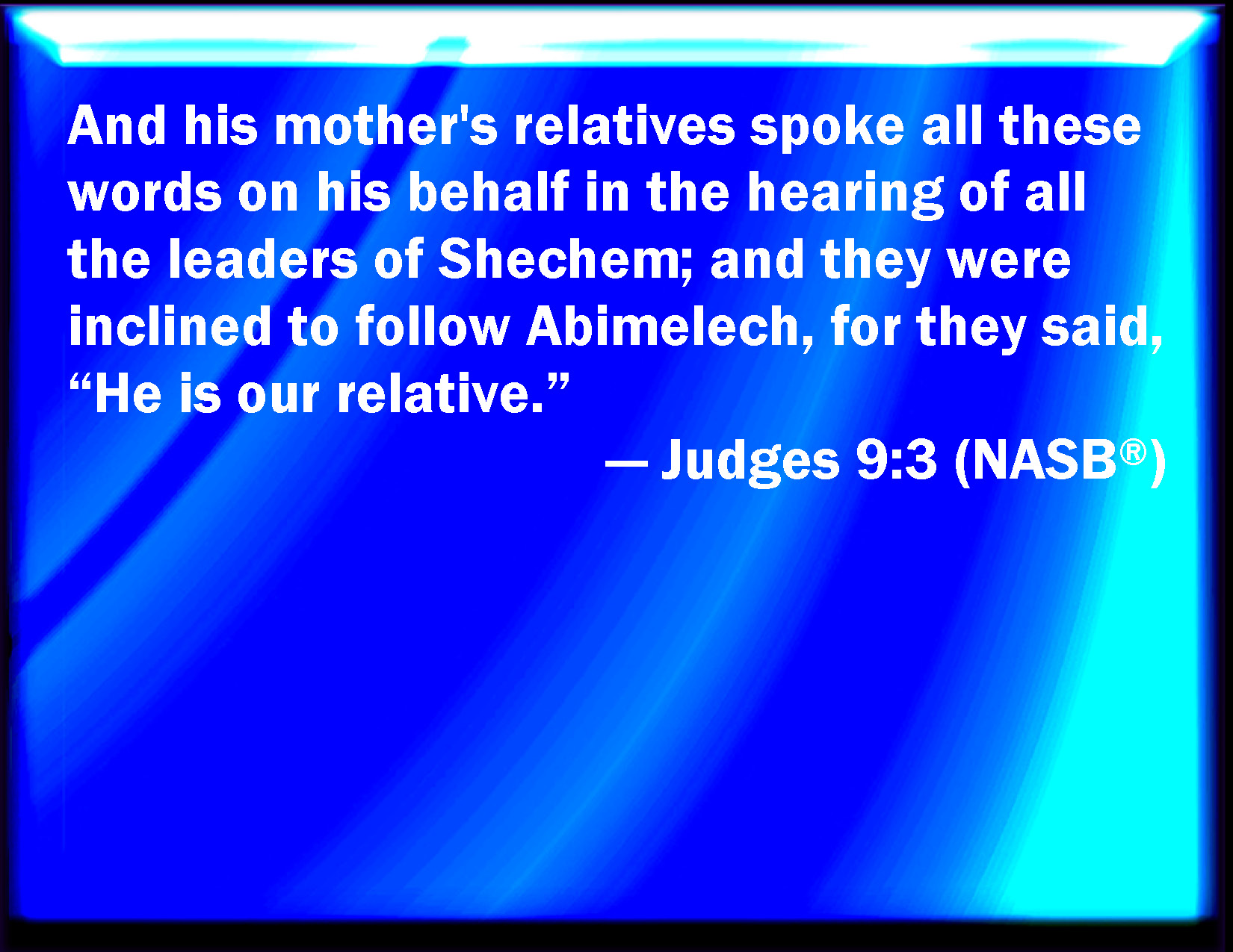 Bible Verse Slide Judges 9:3 And his mother's brothers spoke of him in the ears of all the men of Shechem all these words: and their hearts inclined to follow Abimelech; for they said, He is our brother. KJV: And his mother's brethren spake of him in the ears of all the men of Shechem all these words: and their hearts inclined to follow Abimelech; for they said, He is our brother. DRB: And his mother's brethren spoke of him to all the men of Sichem, all these words, and they inclined their hearts after Abimelech, saying: He is our brother: DBT: And his mother's kinsmen spoke all these words on his behalf in the ears of all the men of Shechem; and their hearts inclined to follow Abim'elech, for they said, "He is our brother." ERV: And his mother's brethren spake of him in the ears of all the men of Shechem all these words: and their hearts inclined to follow Abimelech; for they said, He is our brother. WBT: And his mother's brethren spoke of him in the ears of all the men of Shechem all these words: and their hearts inclined to follow Abimelech; for they said, He is our brother. WEB: His mother's brothers spoke of him in the ears of all the men of Shechem all these words: and their hearts inclined to follow Abimelech; for they said, "He is our brother." YLT: And his mother's brethren speak concerning him, in the ears of all the masters of Shechem, all these words, and their heart inclineth after Abimelech, for they said, 'He is our brother;'Links Judges 9:3 NIV • Judges 9:3 NLT • Judges 9:3 ESV • Judges 9:3 NASB • Judges 9:3 KJV • Judges 9:3 Interlinear • Judges 9:3 Commentaries • Judges 9:3 Parallel Texts • Judges 9:3 Bible Apps • Judges 9:3 Parallel • Bible Hub |