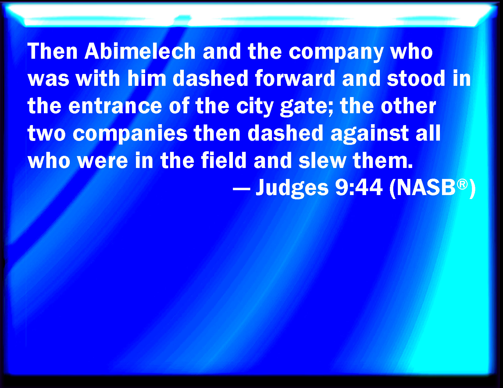 Bible Verse Slide Judges 9:44 And Abimelech, and the company that was with him, rushed forward, and stood in the entering of the gate of the city: and the two other companies ran on all the people that were in the fields, and slew them. KJV: And Abimelech, and the company that was with him, rushed forward, and stood in the entering of the gate of the city: and the two other companies ran upon all the people that were in the fields, and slew them. DRB: With his own company, assaulting and besieging the city: whilst the two other companies chased the enemies that were scattered about the field. DBT: Abim'elech and the company that was with him rushed forward and stood at the entrance of the gate of the city, while the two companies rushed upon all who were in the fields and slew them. ERV: And Abimelech, and the companies that were with him, rushed forward, and stood in the entering of the gate of the city: and the two companies rushed upon all that were in the field, and smote them. WBT: And Abimelech, and the company that was with him, rushed forward, and stood in the entrance of the gate of the city: and the two other companies ran upon all the people that were in the fields, and slew them. WEB: Abimelech, and the companies that were with him, rushed forward, and stood in the entrance of the gate of the city: and the two companies rushed on all who were in the field, and struck them. YLT: And Abimelech and the detachments who are with him have pushed on, and stand at the opening of the gate of the city, and the two detachments have pushed against all who are in the field, and smite them,Links Judges 9:44 NIV • Judges 9:44 NLT • Judges 9:44 ESV • Judges 9:44 NASB • Judges 9:44 KJV • Judges 9:44 Interlinear • Judges 9:44 Commentaries • Judges 9:44 Parallel Texts • Judges 9:44 Bible Apps • Judges 9:44 Parallel • Bible Hub |