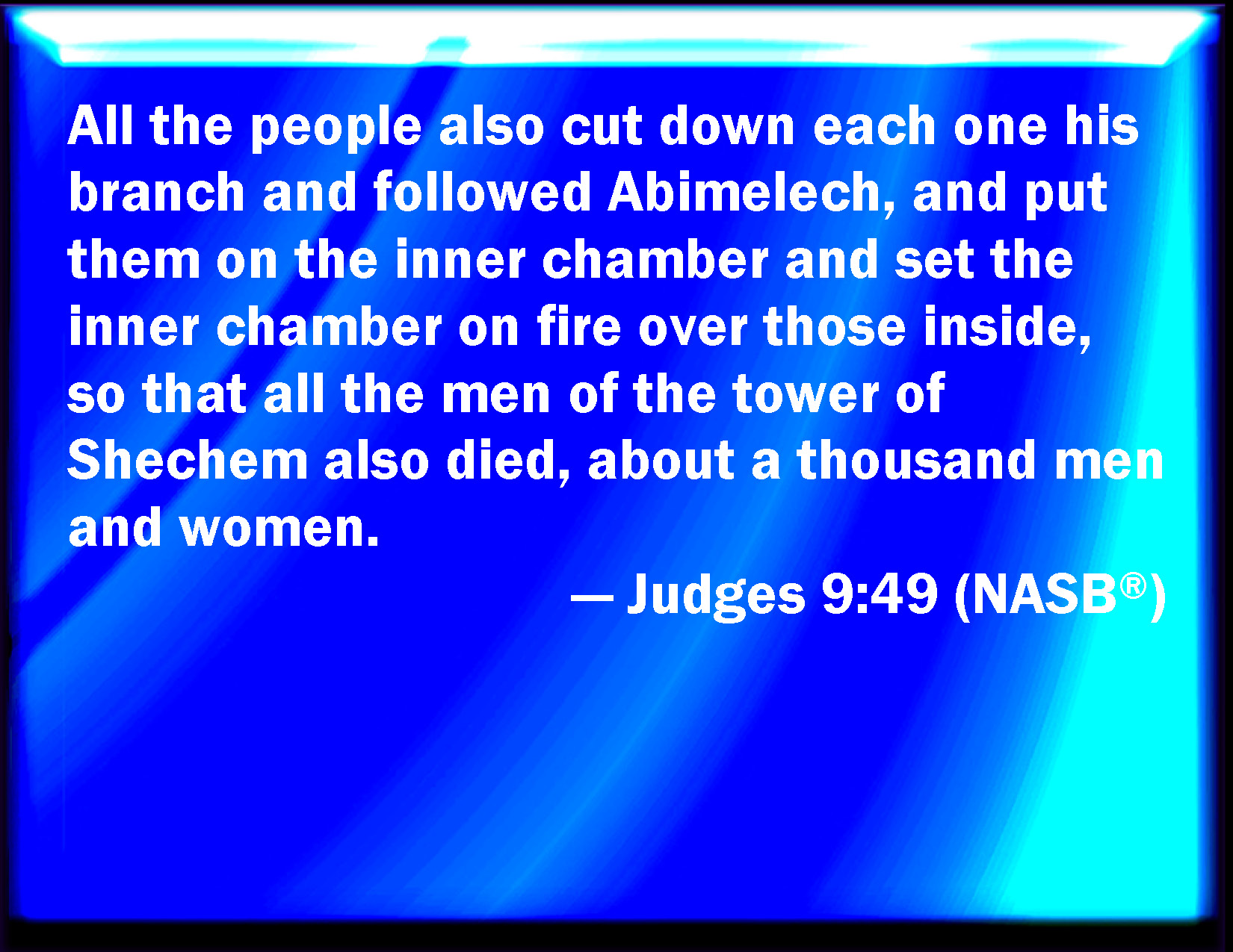 Bible Verse Slide Judges 9:49 And all the people likewise cut down every man his bough, and followed Abimelech, and put them to the hold, and set the hold on fire on them; so that all the men of the tower of Shechem died also, about a thousand men and women. KJV: And all the people likewise cut down every man his bough, and followed Abimelech, and put them to the hold, and set the hold on fire upon them; so that all the men of the tower of Shechem died also, about a thousand men and women. DRB: So they cut down boughs from the trees, every man as fast as he could, and followed their leader. And surrounding the fort they set it on fire: and so it came to pass that with the smoke and with the fire a thousand persons were killed, men and women together, of the inhabitants of the tower of Sichem. DBT: So every one of the people cut down his bundle and following Abim'elech put it against the stronghold, and they set the stronghold on fire over them, so that all the people of the Tower of Shechem also died, about a thousand men and women. ERV: And all the people likewise cut down every man his bough, and followed Abimelech, and put them to the hold, and set the hold on fire upon them; so that all the men of the tower of Shechem died also, about a thousand men and women. WBT: And all the people likewise cut down every man his bough, and followed Abimelech, and put them to the hold, and set the hold on fire upon them: so that all the men of the tower of Shechem died also, about a thousand men and women. WEB: All the people likewise each cut down his bough, and followed Abimelech, and put them at the base of the stronghold, and set the stronghold on fire on them; so that all the people of the tower of Shechem died also, about a thousand men and women. YLT: And all the people also cut down each one his bough, and go after Abimelech, and set them at the high place, and burn by these the high place with fire, and also all the men of the tower of Shechem die, about a thousand men and women.Links Judges 9:49 NIV • Judges 9:49 NLT • Judges 9:49 ESV • Judges 9:49 NASB • Judges 9:49 KJV • Judges 9:49 Interlinear • Judges 9:49 Commentaries • Judges 9:49 Parallel Texts • Judges 9:49 Bible Apps • Judges 9:49 Parallel • Bible Hub |