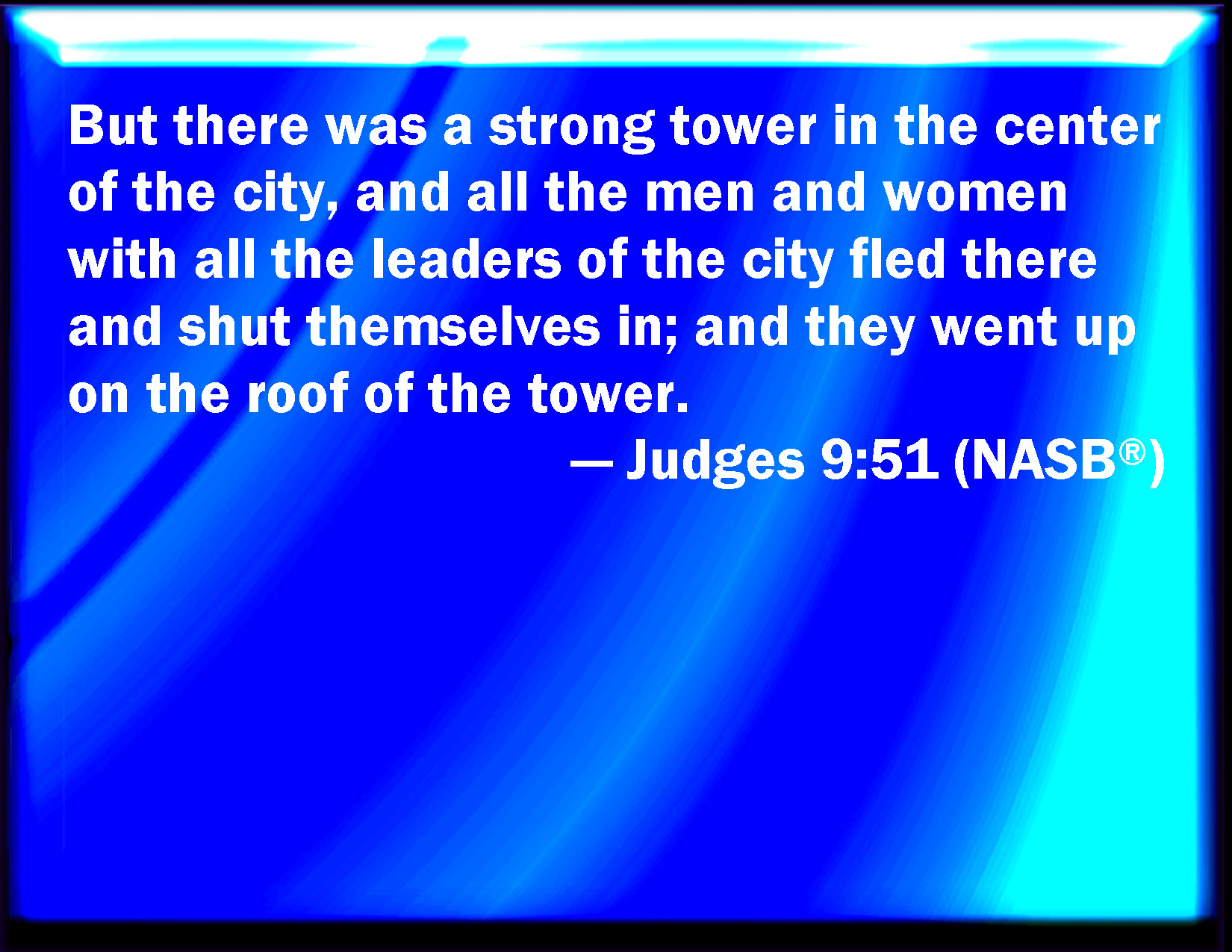 Bible Verse Slide Judges 9:51 But there was a strong tower within the city, and thither fled all the men and women, and all they of the city, and shut it to them, and got them up to the top of the tower. KJV: But there was a strong tower within the city, and thither fled all the men and women, and all they of the city, and shut it to them, and gat them up to the top of the tower. DRB: And there was in the midst of the city a high tower, to which both the men and the women were fled together, and all the princes of the city, and having shut and strongly barred the gate, they stood upon the battlements of the tower to defend themselves. DBT: But there was a strong tower within the city, and all the people of the city fled to it, all the men and women, and shut themselves in; and they went to the roof of the tower. ERV: But there was a strong tower within the city, and thither fled all the men and women, and all they of the city, and shut themselves in, and gat them up to the roof of the tower. WBT: But there was a strong tower within the city, and thither fled all the men and women, and all they of the city, and shut it after them, and ascended to the top of the tower. WEB: But there was a strong tower within the city, and there fled all the men and women, and all they of the city, and shut themselves in, and went up to the roof of the tower. YLT: and a strong tower hath been in the midst of the city, and thither flee do all the men and the women, and all the masters of the city, and they shut it behind them, and go up on the roof of the tower.Links Judges 9:51 NIV • Judges 9:51 NLT • Judges 9:51 ESV • Judges 9:51 NASB • Judges 9:51 KJV • Judges 9:51 Interlinear • Judges 9:51 Commentaries • Judges 9:51 Parallel Texts • Judges 9:51 Bible Apps • Judges 9:51 Parallel • Bible Hub |