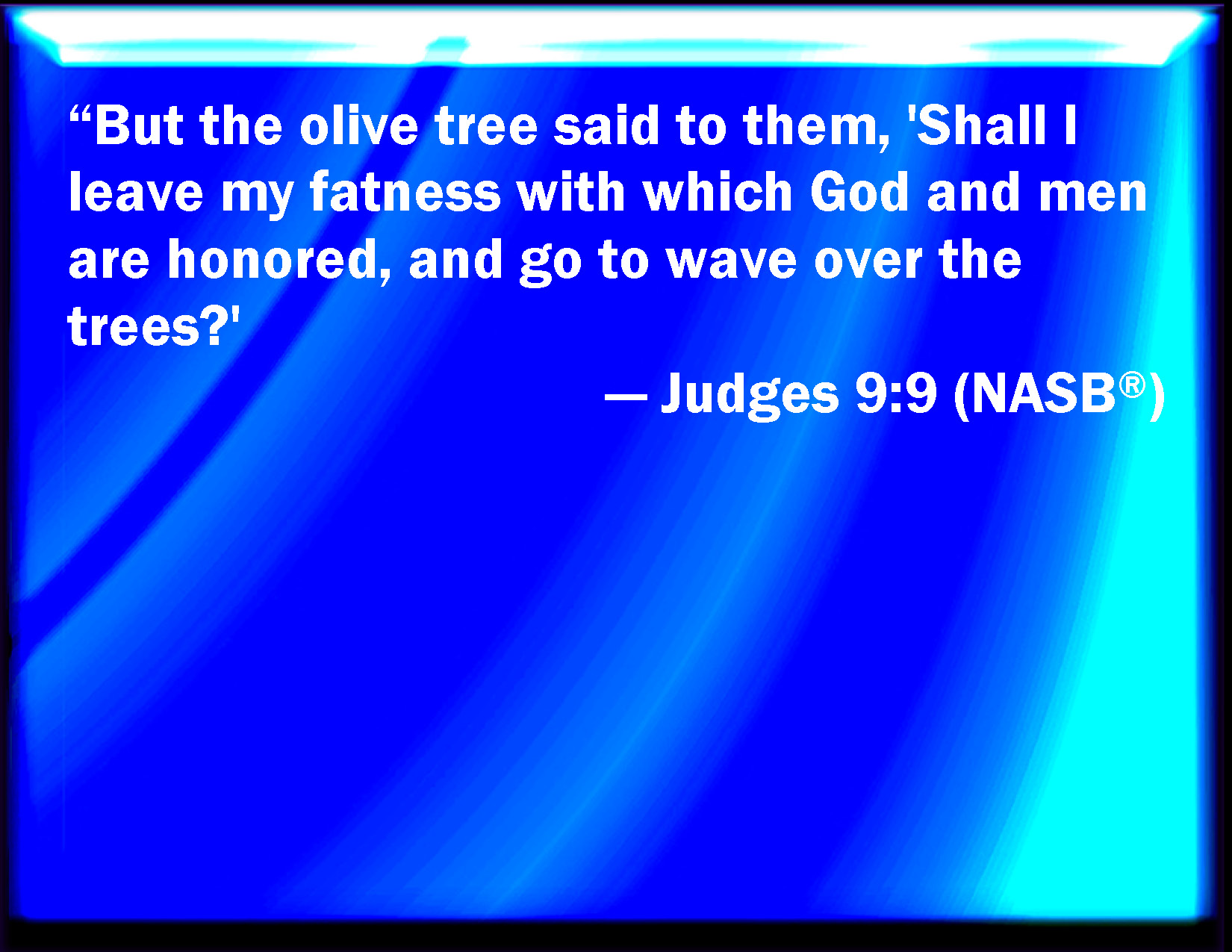 Bible Verse Slide Judges 9:9 But the olive tree said to them, Should I leave my fatness, with which by me they honor God and man, and go to be promoted over the trees? KJV: But the olive tree said unto them, Should I leave my fatness, wherewith by me they honour God and man, and go to be promoted over the trees? DRB: And it answered: Can I leave my fatness, which both gods and men make use of, to come to be promoted among the trees? DBT: But the olive tree said to them, 'Shall I leave my fatness, by which gods and men are honored, and go to sway over the trees?' ERV: But the olive tree said unto them, Should I leave my fatness, wherewith by me they honour God and man, and go to wave to and fro over the trees? WBT: But the olive-tree said to them, Should I leave my fatness, with which by me they honor God and man, and go to be promoted over the trees? WEB: "But the olive tree said to them, 'Should I leave my fatness, with which by me they honor God and man, and go to wave back and forth over the trees?' YLT: And the olive saith to them, Have I ceased from my fatness, by which they honour gods and men, that I have gone to stagger over the trees?Links Judges 9:9 NIV • Judges 9:9 NLT • Judges 9:9 ESV • Judges 9:9 NASB • Judges 9:9 KJV • Judges 9:9 Interlinear • Judges 9:9 Commentaries • Judges 9:9 Parallel Texts • Judges 9:9 Bible Apps • Judges 9:9 Parallel • Bible Hub |