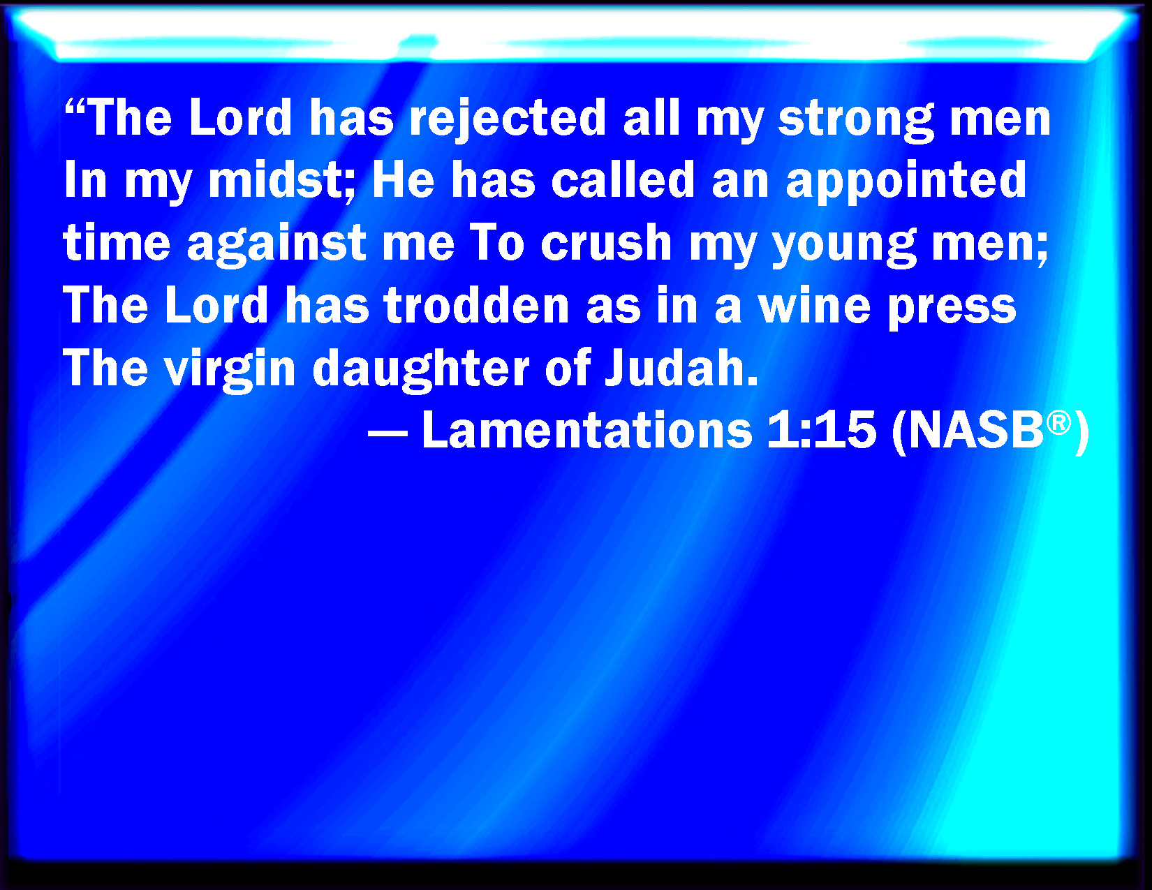 Bible Verse Slide Lamentations 1:15 The LORD has trodden under foot all my mighty men in the middle of me: he has called an assembly against me to crush my young men: the LORD has trodden the virgin, the daughter of Judah, as in a wine press. KJV: The Lord hath trodden under foot all my mighty men in the midst of me: he hath called an assembly against me to crush my young men: the Lord hath trodden the virgin, the daughter of Judah, as in a winepress. DRB: Samech. The Lord hath taken away all my mighty men out of the midst of me: he hath called against me the time, to destroy my chosen men: the Lord hath trodden the winepress for the virgin daughter of Juda. DBT: The Lord hath cast down all my mighty men in the midst of me; he hath called an assembly against me to crush my young men; the Lord hath trodden as a winepress the virgin daughter of Judah. ERV: The Lord hath set at nought all my mighty men in the midst of me; he hath called a solemn assembly against me to crush my young men: the Lord hath trodden as in a winepress the virgin daughter of Judah. WBT: The Lord hath trodden under foot all my mighty men in the midst of me: he hath called an assembly against me to crush my young men: the Lord hath trodden the virgin, the daughter of Judah, as in a wine-press. WEB: The Lord has set at nothing all my mighty men in the midst of me; He has called a solemn assembly against me to crush my young men: The Lord has trodden as in a winepress the virgin daughter of Judah. YLT: Trodden down all my mighty ones hath the Lord in my midst, He proclaimed against me an appointed time, To destroy my young men, A wine-press hath the Lord trodden, To the virgin daughter of Judah.Links Lamentations 1:15 NIV • Lamentations 1:15 NLT • Lamentations 1:15 ESV • Lamentations 1:15 NASB • Lamentations 1:15 KJV • Lamentations 1:15 Interlinear • Lamentations 1:15 Commentaries • Lamentations 1:15 Parallel Texts • Lamentations 1:15 Bible Apps • Lamentations 1:15 Parallel • Bible Hub |