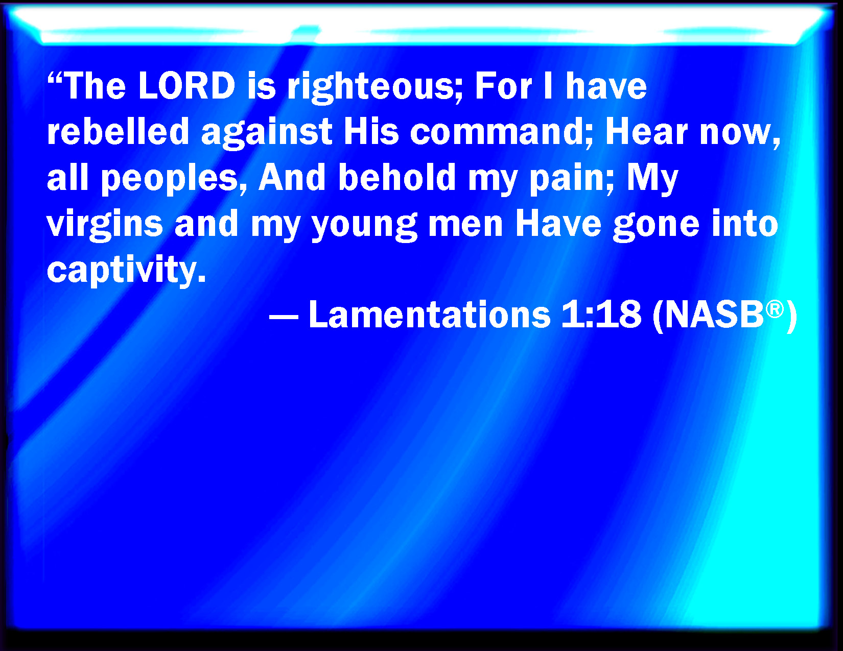 Bible Verse Slide Lamentations 1:18 The LORD is righteous; for I have rebelled against his commandment: hear, I pray you, all people, and behold my sorrow: my virgins and my young men are gone into captivity. KJV: The LORD is righteous; for I have rebelled against his commandment: hear, I pray you, all people, and behold my sorrow: my virgins and my young men are gone into captivity. DRB: Sade. The Lord is just, for I have provoked his mouth to wrath: hear, I pray you, all ye people, and see my sorrow: my virgins, and my young men are gone into captivity. DBT: Jehovah is righteous; for I have rebelled against his commandment. Hear, I pray you, all ye peoples, and behold my sorrow. My virgins and my young men are gone into captivity. ERV: The LORD is righteous; for I have rebelled against his commandment: hear, I pray you, all ye peoples, and behold my sorrow: my virgins and my young men are gone into captivity. WBT: The LORD is righteous; for I have rebelled against his commandment: hear, I pray you, all people, and behold my sorrow: my virgins and my young men are gone into captivity. WEB: Yahweh is righteous; for I have rebelled against his commandment: Please hear all you peoples, and see my sorrow: My virgins and my young men are gone into captivity. YLT: Righteous is Jehovah, For His mouth I have provoked. Hear, I pray you, all ye peoples, and see my pain, My virgins and my young men have gone into captivity.Links Lamentations 1:18 NIV • Lamentations 1:18 NLT • Lamentations 1:18 ESV • Lamentations 1:18 NASB • Lamentations 1:18 KJV • Lamentations 1:18 Interlinear • Lamentations 1:18 Commentaries • Lamentations 1:18 Parallel Texts • Lamentations 1:18 Bible Apps • Lamentations 1:18 Parallel • Bible Hub |