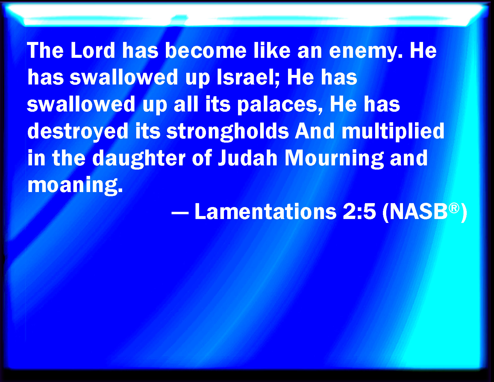 Bible Verse Slide Lamentations 2:5 The LORD was as an enemy: he has swallowed up Israel, he has swallowed up all her palaces: he has destroyed his strong holds, and has increased in the daughter of Judah mourning and lamentation. KJV: The Lord was as an enemy: he hath swallowed up Israel, he hath swallowed up all her palaces: he hath destroyed his strong holds, and hath increased in the daughter of Judah mourning and lamentation. DRB: He. The Lord is become as an enemy: he hath cast down Israel headlong, he hath overthrown all the walls thereof: he hath destroyed his strong holds, and hath multiplied in the daughter of Juda the afflicted, both men and women. DBT: The Lord is become as an enemy: he hath swallowed up Israel; he hath swallowed up all her palaces; he hath destroyed his strongholds, and hath multiplied in the daughter of Judah mourning and lamentation. ERV: The Lord is become as an enemy, he hath swallowed up Israel; he hath swallowed up all her palaces, he hath destroyed his strong holds: and he hath multiplied in the daughter of Judah mourning and lamentation. WBT: The Lord was as an enemy: he hath swallowed up Israel, he hath swallowed up all her palaces: he hath destroyed his strong holds, and hath increased in the daughter of Judah mourning and lamentation. WEB: The Lord is become as an enemy, he has swallowed up Israel; He has swallowed up all her palaces, he has destroyed his strongholds; He has multiplied in the daughter of Judah mourning and lamentation. YLT: The Lord hath been as an enemy, He hath swallowed up Israel, He hath swallowed up all her palaces, He hath destroyed His fortresses, And He multiplieth in the daughter of Judah Mourning and moaning.Links Lamentations 2:5 NIV • Lamentations 2:5 NLT • Lamentations 2:5 ESV • Lamentations 2:5 NASB • Lamentations 2:5 KJV • Lamentations 2:5 Interlinear • Lamentations 2:5 Commentaries • Lamentations 2:5 Parallel Texts • Lamentations 2:5 Bible Apps • Lamentations 2:5 Parallel • Bible Hub |