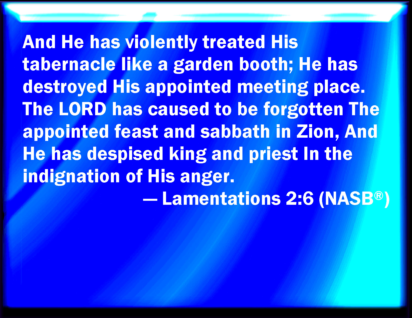 Lamentations 2:6 And he has violently taken away his tabernacle, as if it were of a garden: he has destroyed his places of the assembly: the LORD has caused the solemn feasts and sabbaths to be forgotten in Zion, and has despised in the indignation of his anger the king and the priest.