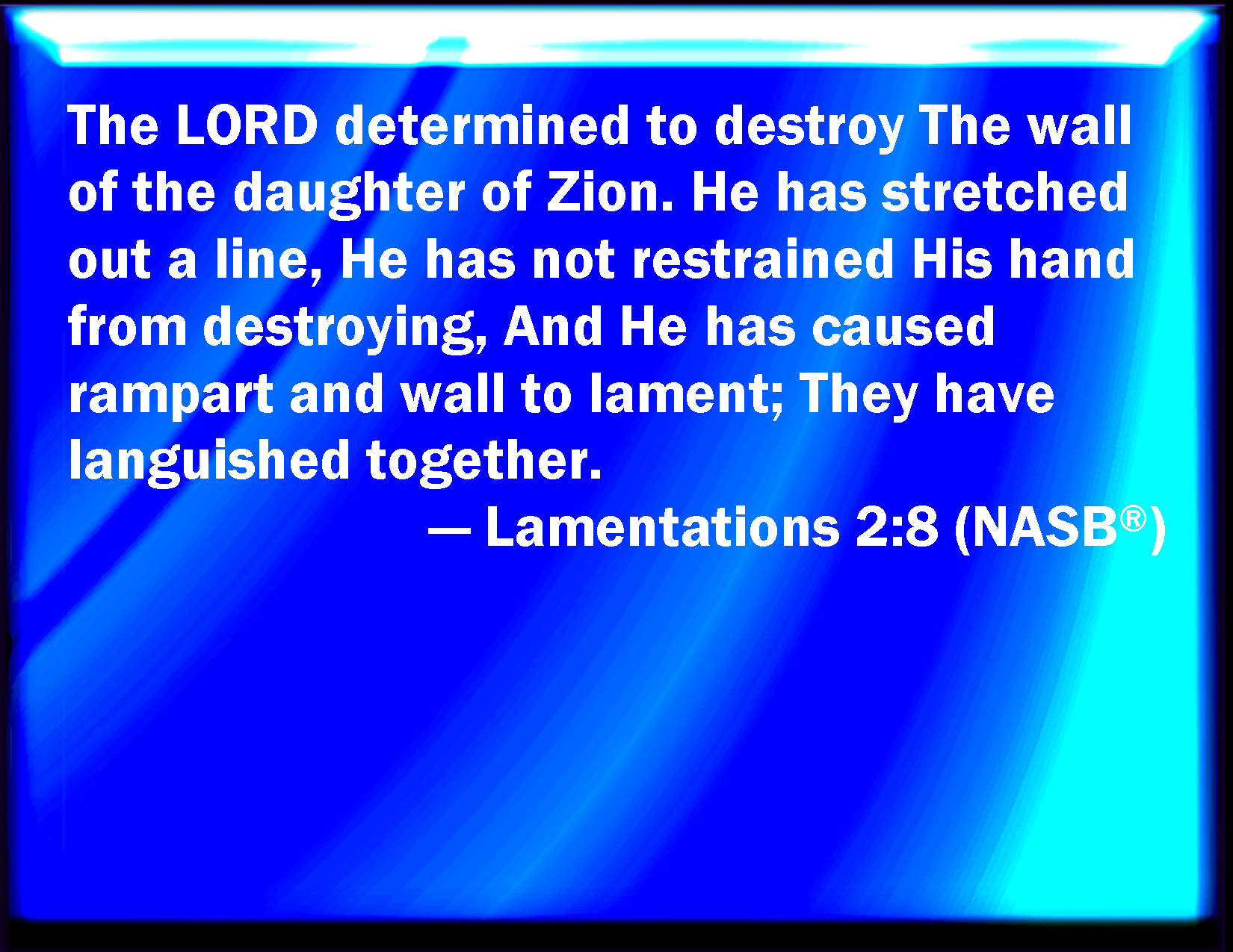Lamentations 2:8 The LORD has purposed to destroy the wall of the daughter of Zion: he has stretched out a line, he has not withdrawn his hand from destroying: therefore he made the rampart and the wall to lament; they languished together.
