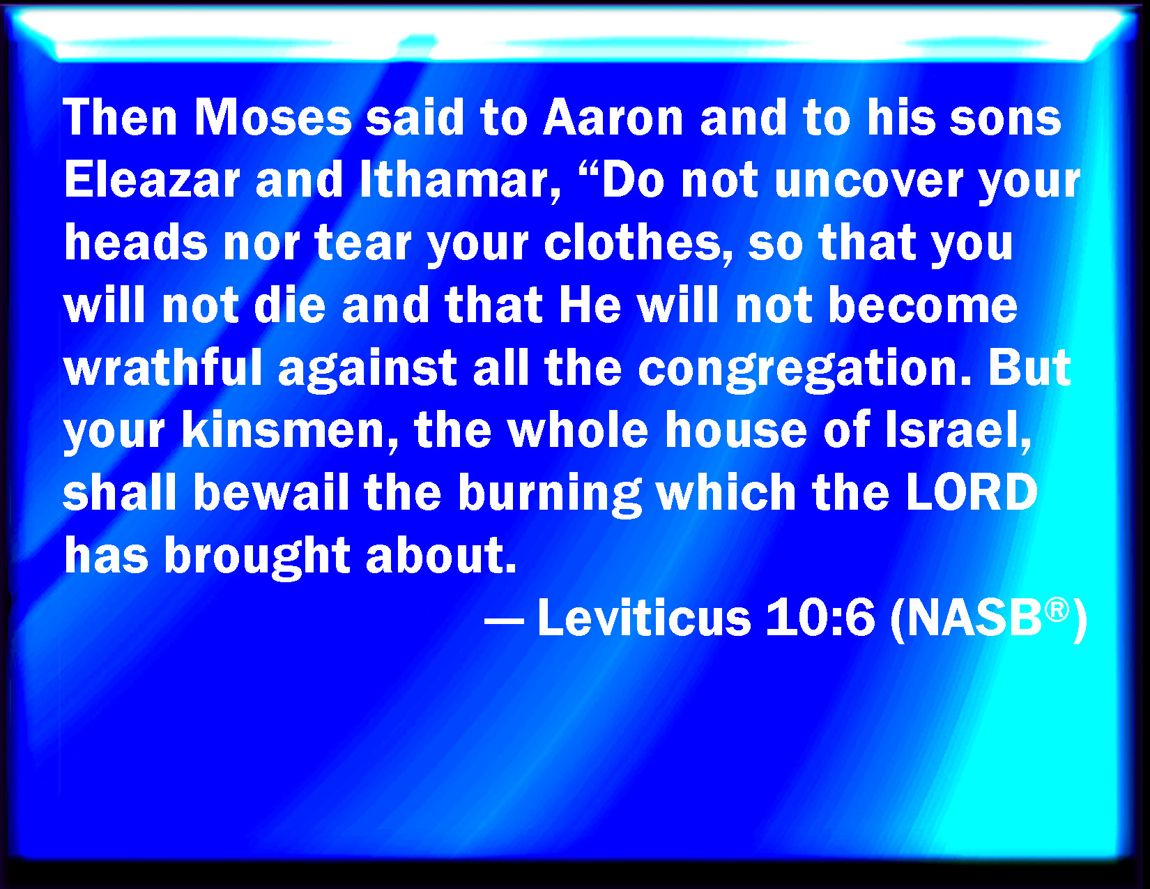 Bible Verse Slide Leviticus 10:6 And Moses said to Aaron, and to Eleazar and to Ithamar, his sons, Uncover not your heads, neither rend your clothes; lest you die, and lest wrath come on all the people: but let your brothers, the whole house of Israel, mourn the burning which the LORD has kindled. KJV: And Moses said unto Aaron, and unto Eleazar and unto Ithamar, his sons, Uncover not your heads, neither rend your clothes; lest ye die, and lest wrath come upon all the people: but let your brethren, the whole house of Israel, bewail the burning which the LORD hath kindled. DRB: And Moses said to Aaron, and to Eleazar and Ithamar, his sons: Uncover not your heads, and rend not your garments, lest perhaps you die, and indignation come upon all the congregation. Let your brethren, and all the house of Israel, bewail the burning which the Lord has kindled: DBT: And Moses said to Aaron, and to Eleazar and to Ithamar his sons, Your heads shall ye not uncover, neither rend your clothes; lest ye die, and lest wrath come on all the assembly; but your brethren, the whole house of Israel, shall bewail the burning which Jehovah hath kindled. ERV: And Moses said unto Aaron, and unto Eleazar and unto Ithamar, his sons, Let not the hair of your heads go loose, neither rend your clothes; that ye die not, and that he be not wroth with all the congregation: but let your brethren, the whole house of Israel, bewail the burning which the LORD hath kindled. WBT: And Moses said to Aaron, and to Eleazar and to Ithamar, his sons, Uncover not your heads, neither rend your clothes; lest ye die, and lest wrath come upon all the people: but let your brethren, the whole house of Israel, bewail the burning which the LORD hath kindled. WEB: Moses said to Aaron, and to Eleazar and to Ithamar, his sons, "Don't let the hair of your heads go loose, neither tear your clothes; that you don't die, and that he not be angry with all the congregation: but let your brothers, the whole house of Israel, bewail the burning which Yahweh has kindled. YLT: And Moses saith unto Aaron, and to Eleazar, and to Ithamar his sons, 'Your heads ye do not uncover, and your garments ye do not rend, that ye die not, and on all the company He be wroth; as to your brethren, the whole house of Israel, they bewail the burning which Jehovah hath kindled;Links Leviticus 10:6 NIV • Leviticus 10:6 NLT • Leviticus 10:6 ESV • Leviticus 10:6 NASB • Leviticus 10:6 KJV • Leviticus 10:6 Interlinear • Leviticus 10:6 Commentaries • Leviticus 10:6 Parallel Texts • Leviticus 10:6 Bible Apps • Leviticus 10:6 Parallel • Bible Hub |