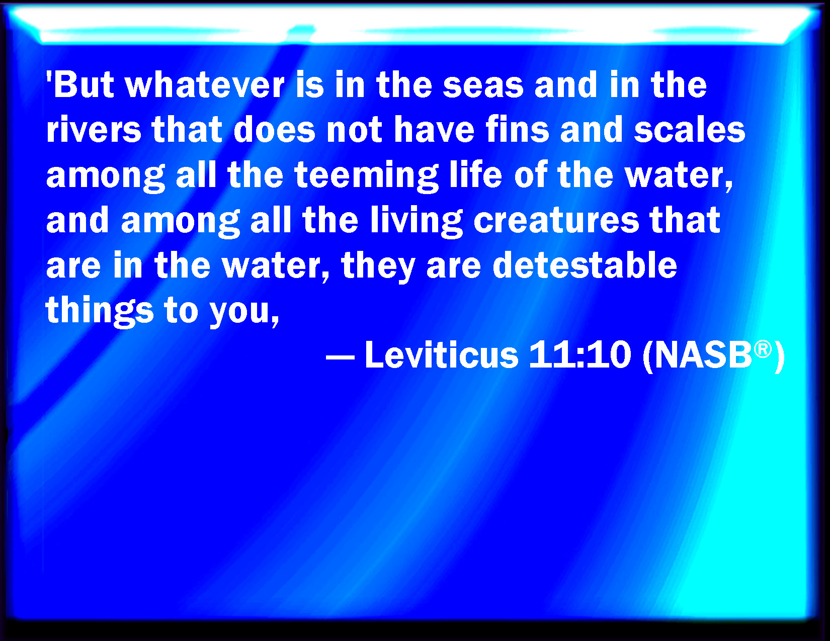 Bible Verse Slide Leviticus 11:10 And all that have not fins and scales in the seas, and in the rivers, of all that move in the waters, and of any living thing which is in the waters, they shall be an abomination to you: KJV: And all that have not fins and scales in the seas, and in the rivers, of all that move in the waters, and of any living thing which is in the waters, they shall be an abomination unto you: DRB: But whatsoever hath not fins and scales, of those things that move and live in the waters, shall be an abomination to you, DBT: but all that have not fins and scales in seas and in rivers, of all that swarm in the waters, and of every living soul which is in the waters they shall be an abomination unto you. ERV: And all that have not fins and scales in the seas, and in the rivers, of all that move in the waters, and of all the living creatures that are in the waters, they are an abomination unto you, WBT: And all that have not fins nor scales in the seas, and in the rivers, of all that move in the waters, and of any living animal which is in the waters, they shall be an abomination to you: WEB: All that don't have fins and scales in the seas, and in the rivers, of all that move in the waters, and of all the living creatures that are in the waters, they are an abomination to you, YLT: and any one that hath not fins and scales in the seas, and in the brooks, of any teeming creature of the waters, and of any creature which liveth, which is in the waters — an abomination they are to you;Links Leviticus 11:10 NIV • Leviticus 11:10 NLT • Leviticus 11:10 ESV • Leviticus 11:10 NASB • Leviticus 11:10 KJV • Leviticus 11:10 Interlinear • Leviticus 11:10 Commentaries • Leviticus 11:10 Parallel Texts • Leviticus 11:10 Bible Apps • Leviticus 11:10 Parallel • Bible Hub |