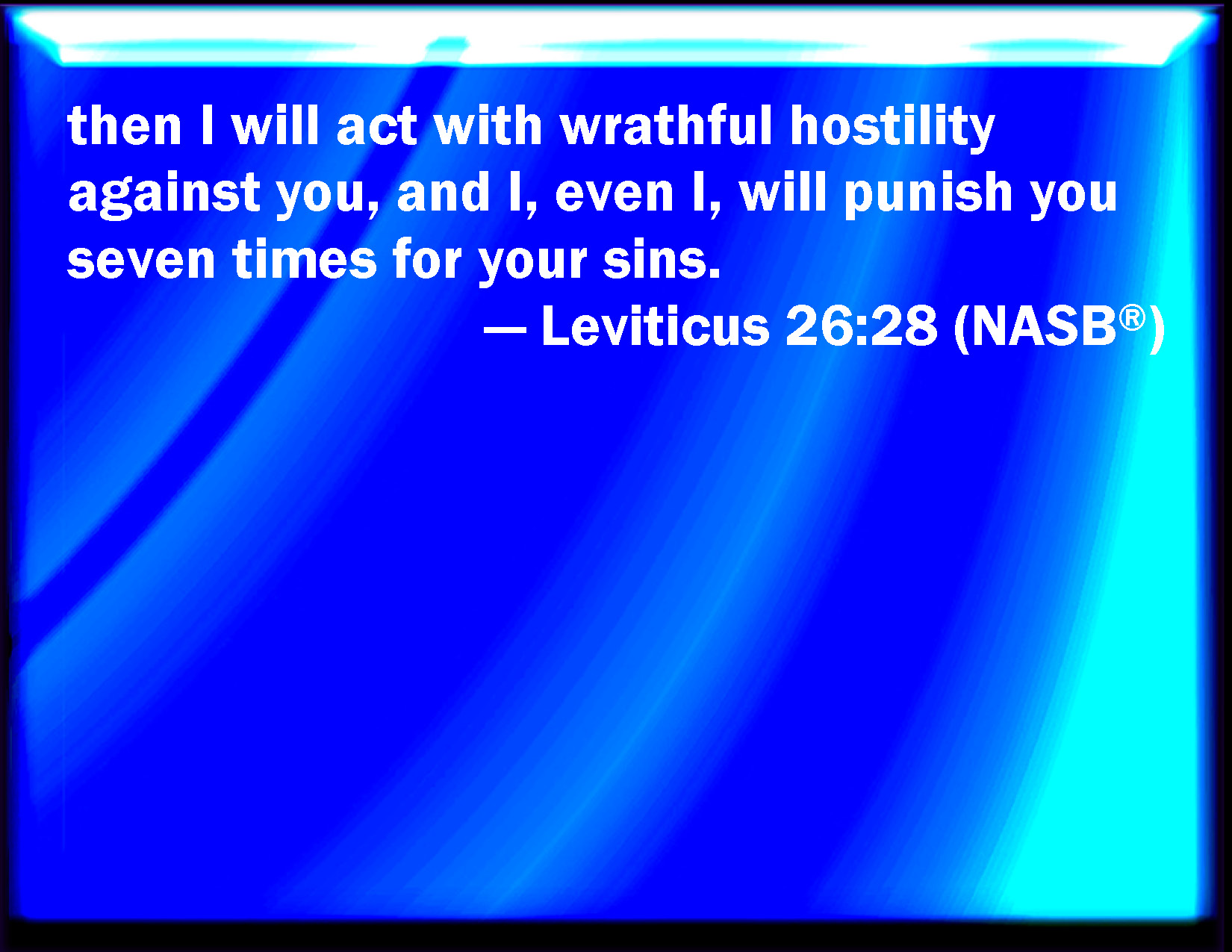 Bible Verse Slide Leviticus 26:28 Then I will walk contrary to you also in fury; and I, even I, will chastise you seven times for your sins. KJV: Then I will walk contrary unto you also in fury; and I, even I, will chastise you seven times for your sins. DRB: I will also go against you with opposite fury, and I will chastise you with seven plagues for your sins, DBT: then I will walk contrary unto you also in fury; and I, even I, will chastise you seven-fold for your sins. ERV: then I will walk contrary unto you in fury; and I also will chastise you seven times for your sins. WBT: Then I will walk contrary to you also in fury; and I, even I, will chastise you seven times for your sins. WEB: then I will walk contrary to you in wrath; and I also will chastise you seven times for your sins. YLT: then I have walked with you in the fury of opposition, and have chastised you, even I, seven times for your sins.Links Leviticus 26:28 NIV • Leviticus 26:28 NLT • Leviticus 26:28 ESV • Leviticus 26:28 NASB • Leviticus 26:28 KJV • Leviticus 26:28 Interlinear • Leviticus 26:28 Commentaries • Leviticus 26:28 Parallel Texts • Leviticus 26:28 Bible Apps • Leviticus 26:28 Parallel • Bible Hub |