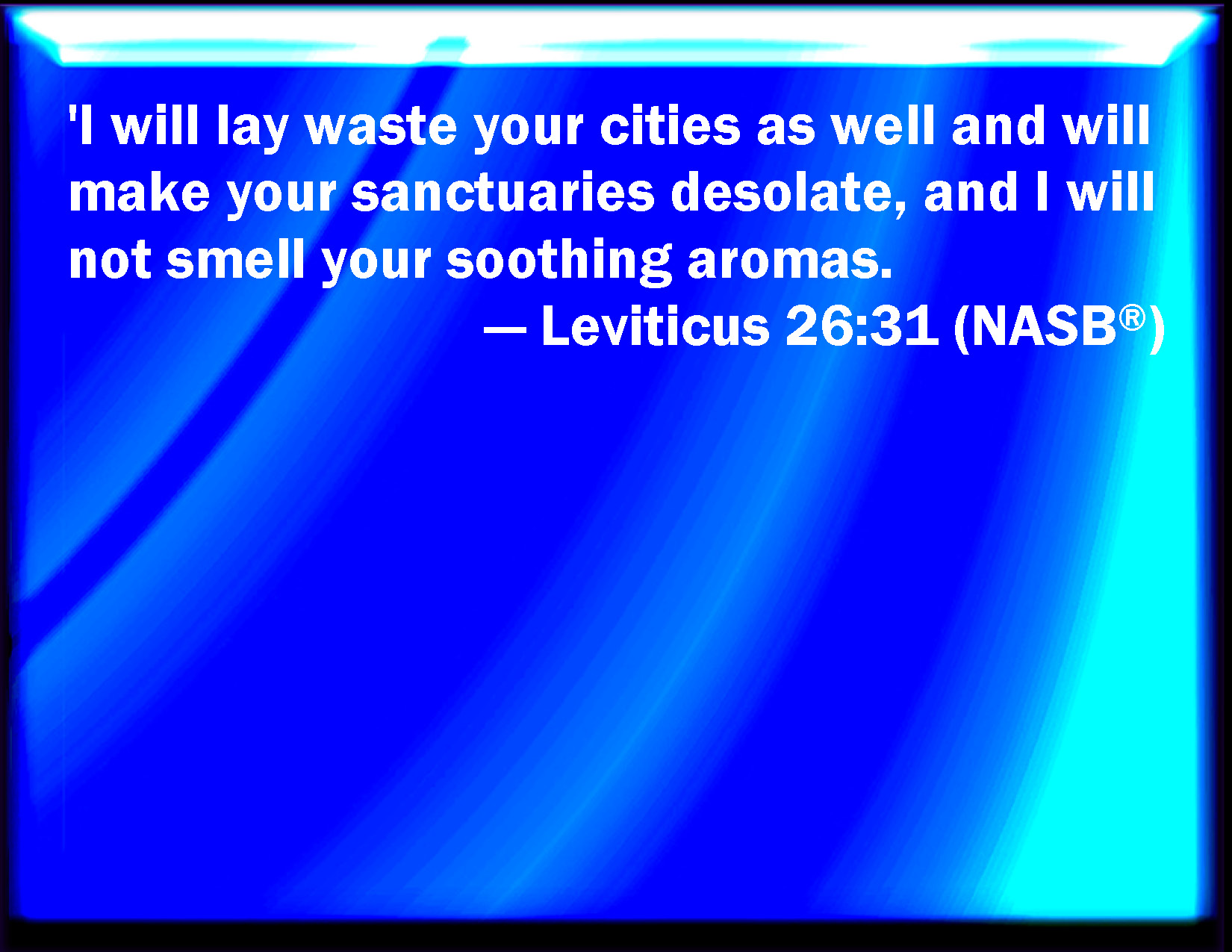 Bible Verse Slide Leviticus 26:31 And I will make your cities waste, and bring your sanctuaries to desolation, and I will not smell the smell of your sweet odors. KJV: And I will make your cities waste, and bring your sanctuaries unto desolation, and I will not smell the savour of your sweet odours. DRB: Insomuch that I will bring your cities to be a wilderness, and I will make your sanctuaries desolate, and will receive no more your sweet odours. DBT: And I will lay waste your cities and desolate your sanctuaries; and I will not smell your sweet odours. ERV: And I will make your cities a waste, and will bring your sanctuaries unto desolation, and I will not smell the savour of your sweet odours. WBT: And I will make your cities waste, and bring your sanctuaries to desolation, and I will not smell the savor of your sweet odors. WEB: I will lay your cities waste, and will bring your sanctuaries to desolation, and I will not take delight in the sweet fragrance of your offerings. YLT: and I have made your cities a waste, and have made desolate your sanctuaries, and I smell not at your sweet fragrances;Links Leviticus 26:31 NIV • Leviticus 26:31 NLT • Leviticus 26:31 ESV • Leviticus 26:31 NASB • Leviticus 26:31 KJV • Leviticus 26:31 Interlinear • Leviticus 26:31 Commentaries • Leviticus 26:31 Parallel Texts • Leviticus 26:31 Bible Apps • Leviticus 26:31 Parallel • Bible Hub |