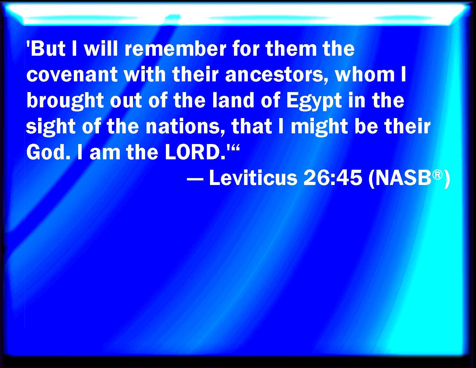 Bible Verse Slide Leviticus 26:45 But I will for their sakes remember the covenant of their ancestors, whom I brought forth out of the land of Egypt in the sight of the heathen, that I might be their God: I am the LORD. KJV: But I will for their sakes remember the covenant of their ancestors, whom I brought forth out of the land of Egypt in the sight of the heathen, that I might be their God: I am the LORD. DRB: And I will remember my former covenant, when I brought them out of the land of Egypt, in the sight of the Gentiles, to be their God. I am the Lord. These are the judgments, and precepts, and laws, which the Lord gave between him and the children of Israel in mount Sinai by the hand of Moses. DBT: But I will remember toward them the covenant with their ancestors whom I brought forth out of the land of Egypt before the eyes of the nations, that I might be their God: I am Jehovah. ERV: but I will for their sakes remember the covenant of their ancestors, whom I brought forth out of the land of Egypt in the sight of the nations, that I might be their God: I am the LORD. WBT: But I will for their sakes remember the covenant of their ancestors, whom I brought out of the land of Egypt in the sight of the heathen, that I might be their God: I am the LORD. WEB: but I will for their sake remember the covenant of their ancestors, whom I brought forth out of the land of Egypt in the sight of the nations, that I might be their God. I am Yahweh.'" YLT: then I have remembered for them the covenant of the ancestors, whom I brought forth out of the land of Egypt before the eyes of the nations to become their God; I am Jehovah.'Links Leviticus 26:45 NIV • Leviticus 26:45 NLT • Leviticus 26:45 ESV • Leviticus 26:45 NASB • Leviticus 26:45 KJV • Leviticus 26:45 Interlinear • Leviticus 26:45 Commentaries • Leviticus 26:45 Parallel Texts • Leviticus 26:45 Bible Apps • Leviticus 26:45 Parallel • Bible Hub |