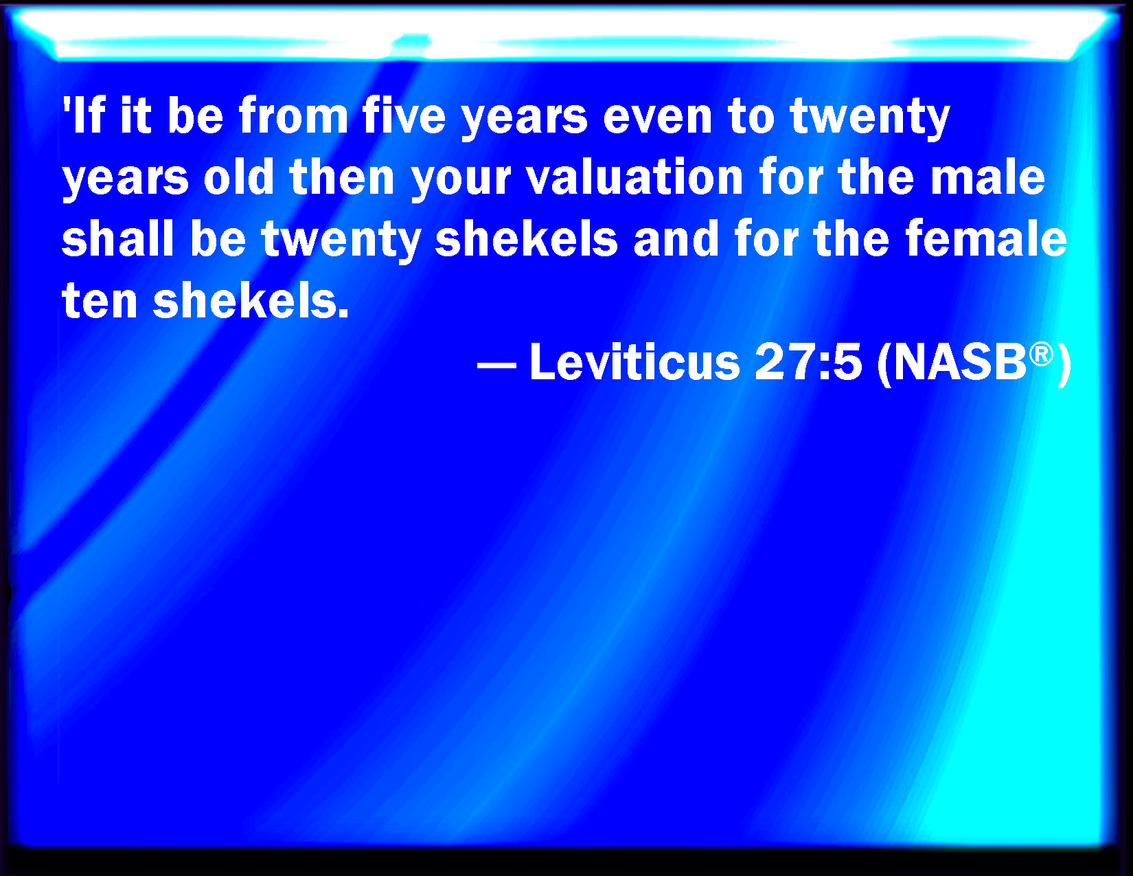 Bible Verse Slide Leviticus 27:5 And if it be from five years old even to twenty years old, then your estimation shall be of the male twenty shekels, and for the female ten shekels. KJV: And if it be from five years old even unto twenty years old, then thy estimation shall be of the male twenty shekels, and for the female ten shekels. DRB: But from the fifth year until the twentieth, a man shall give twenty sicles: a woman ten. DBT: And if it be from five years old even unto twenty years old, thy valuation of the male shall be twenty shekels, and for the female ten shekels. ERV: And if it be from five years old even unto twenty years old, then thy estimation shall be of the male twenty shekels, and for the female ten shekels. WBT: And if it shall be from five years old even to twenty years old, then thy estimation shall be of the male twenty shekels, and for the female ten shekels. WEB: If the person is from five years old even to twenty years old, then your valuation shall be for a male twenty shekels, and for a female ten shekels. YLT: and if from a son of five years even unto a son of twenty years — then hath thy valuation been of the male twenty shekels, and for the female, ten shekels;Links Leviticus 27:5 NIV • Leviticus 27:5 NLT • Leviticus 27:5 ESV • Leviticus 27:5 NASB • Leviticus 27:5 KJV • Leviticus 27:5 Interlinear • Leviticus 27:5 Commentaries • Leviticus 27:5 Parallel Texts • Leviticus 27:5 Bible Apps • Leviticus 27:5 Parallel • Bible Hub |