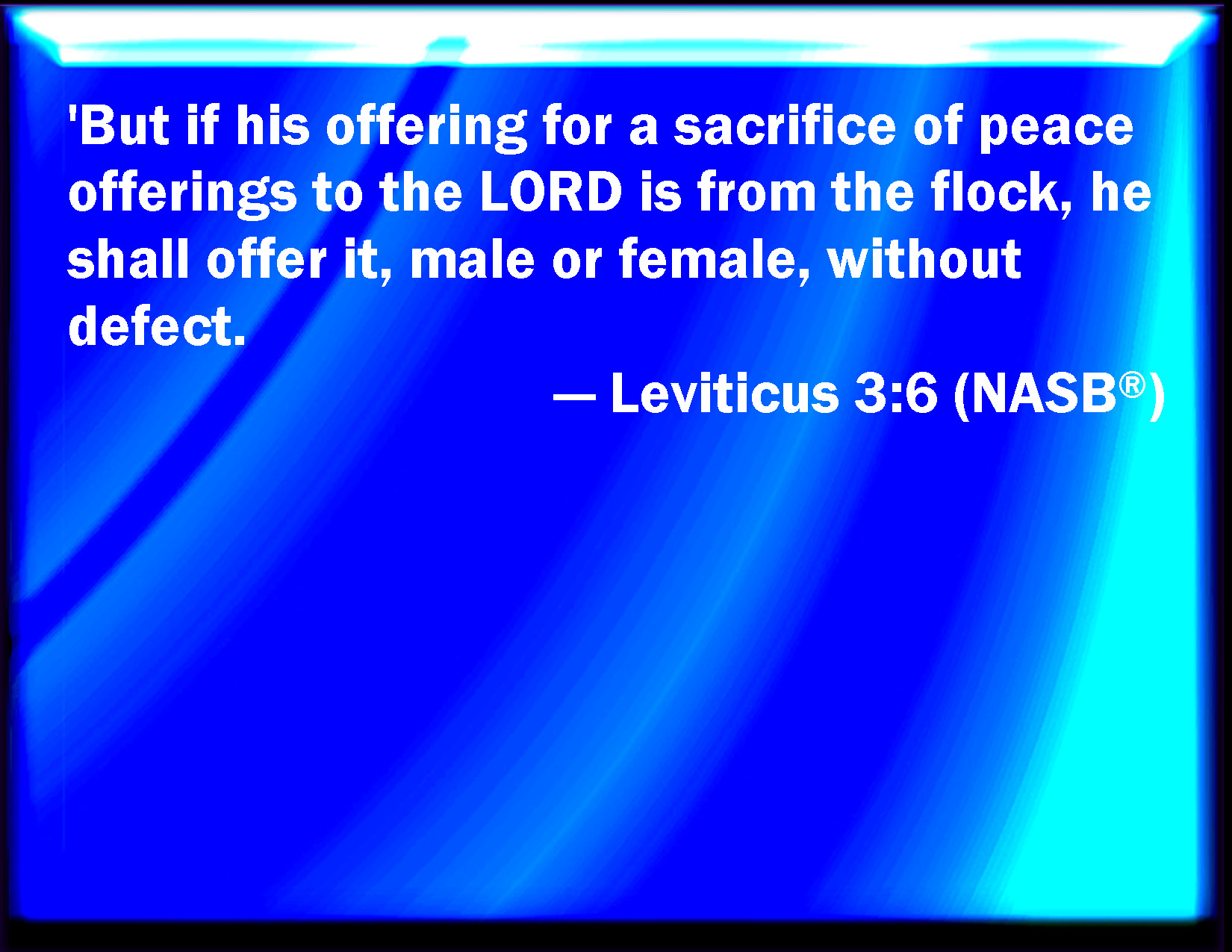 Bible Verse Slide Leviticus 3:6 And if his offering for a sacrifice of peace offering to the LORD be of the flock; male or female, he shall offer it without blemish. KJV: And if his offering for a sacrifice of peace offering unto the LORD be of the flock; male or female, he shall offer it without blemish. DRB: But if his oblation and the sacrifice of peace offering be of the flock, whether he offer male or female, they shall be without blemish. DBT: And if his offering for a sacrifice of peace-offering to Jehovah be of small cattle, male or female, he shall present it without blemish. ERV: And if his oblation for a sacrifice of peace offerings unto the LORD be of the flock; male or female, he shall offer it without blemish. WBT: And if his offering for a sacrifice of peace-offering to the LORD shall be of the flock, male or female; he shall offer it without blemish. WEB: "'If his offering for a sacrifice of peace offerings to Yahweh is from the flock; male or female, he shall offer it without blemish. YLT: And if his offering is out of the flock for a sacrifice of peace-offerings to Jehovah, male or female, a perfect one he doth bring near;Links Leviticus 3:6 NIV • Leviticus 3:6 NLT • Leviticus 3:6 ESV • Leviticus 3:6 NASB • Leviticus 3:6 KJV • Leviticus 3:6 Interlinear • Leviticus 3:6 Commentaries • Leviticus 3:6 Parallel Texts • Leviticus 3:6 Bible Apps • Leviticus 3:6 Parallel • Bible Hub |