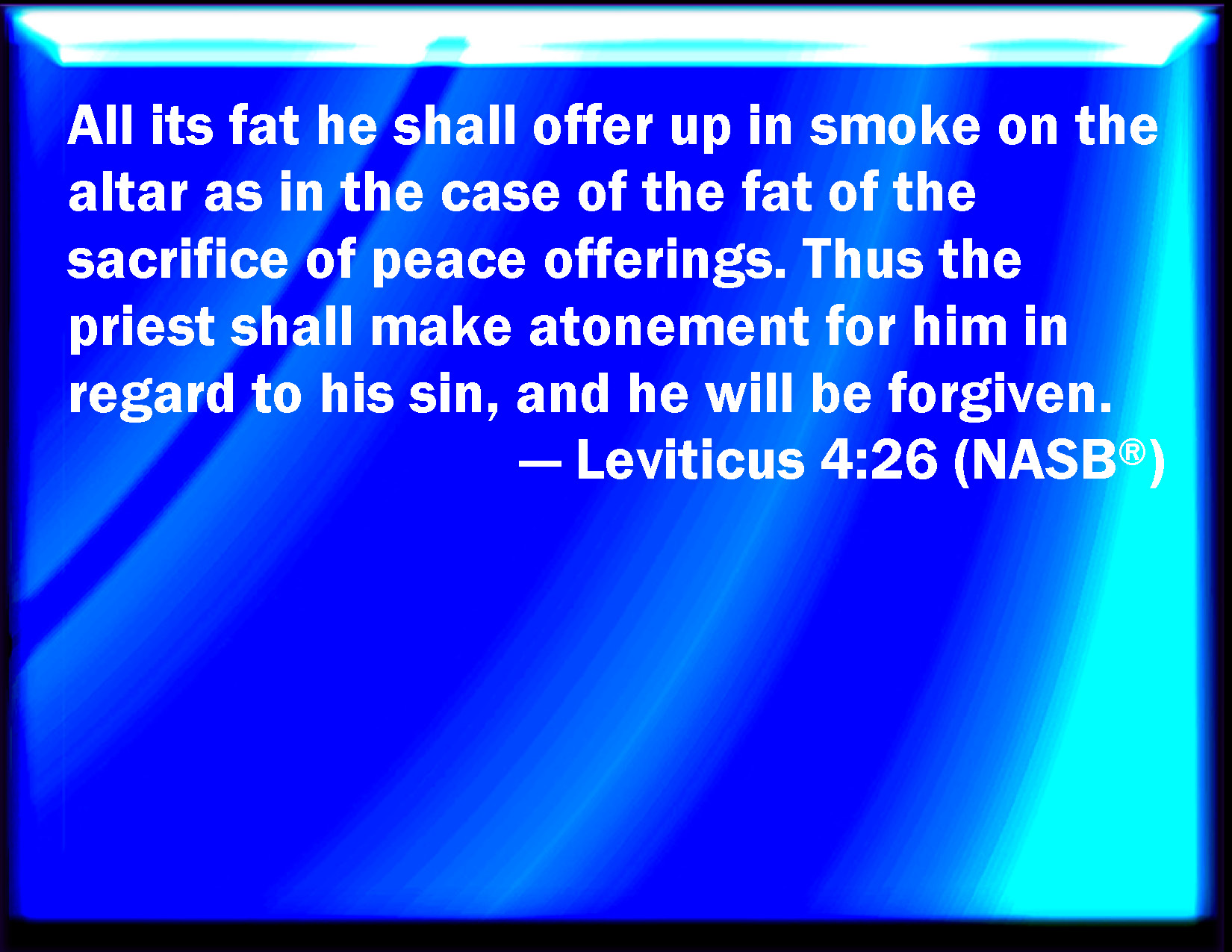 Bible Verse Slide Leviticus 4:26 And he shall burn all his fat on the altar, as the fat of the sacrifice of peace offerings: and the priest shall make an atonement for him as concerning his sin, and it shall be forgiven him. KJV: And he shall burn all his fat upon the altar, as the fat of the sacrifice of peace offerings: and the priest shall make an atonement for him as concerning his sin, and it shall be forgiven him. DRB: But the fat he shall burn upon it, as is wont to be done with the victims of peace offerings: and the priest shall pray for him, and for his sin, and it shall be forgiven him. DBT: And he shall burn all its fat on the altar, as the fat of the sacrifice of peace-offering; and the priest shall make atonement for him to cleanse him from his sin, and it shall be forgiven him. ERV: And all the fat thereof shall he burn upon the altar, as the fat of the sacrifice of peace offerings: and the priest shall make atonement for him as concerning his sin, and he shall be forgiven. WBT: And he shall burn all his fat upon the altar, as the fat of the sacrifice of peace-offerings: and the priest shall make an atonement for him as concerning his sin, and it shall be forgiven him. WEB: All its fat he shall burn on the altar, like the fat of the sacrifice of peace offerings; and the priest shall make atonement for him concerning his sin, and he will be forgiven. YLT: and with all its fat he doth make perfume on the altar, as the fat of the sacrifice of the peace-offerings; and the priest hath made atonement for him because of his sin, and it hath been forgiven him.Links Leviticus 4:26 NIV • Leviticus 4:26 NLT • Leviticus 4:26 ESV • Leviticus 4:26 NASB • Leviticus 4:26 KJV • Leviticus 4:26 Interlinear • Leviticus 4:26 Commentaries • Leviticus 4:26 Parallel Texts • Leviticus 4:26 Bible Apps • Leviticus 4:26 Parallel • Bible Hub |