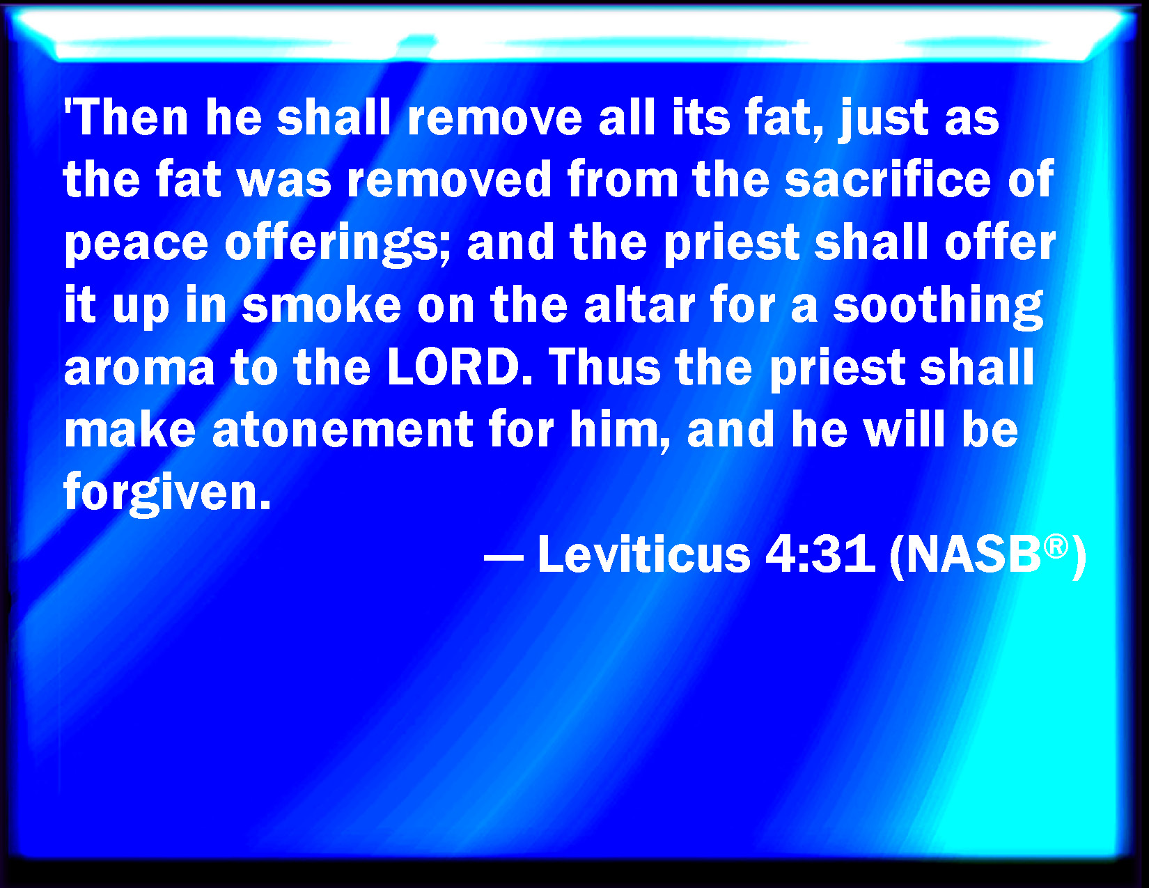 Leviticus 4:31 And he shall take away all the fat thereof, as the fat is taken away from off the sacrifice of peace offerings; and the priest shall burn it on the altar for a sweet smell to the LORD; and the priest shall make an atonement for him, and it shall be forgiven him.