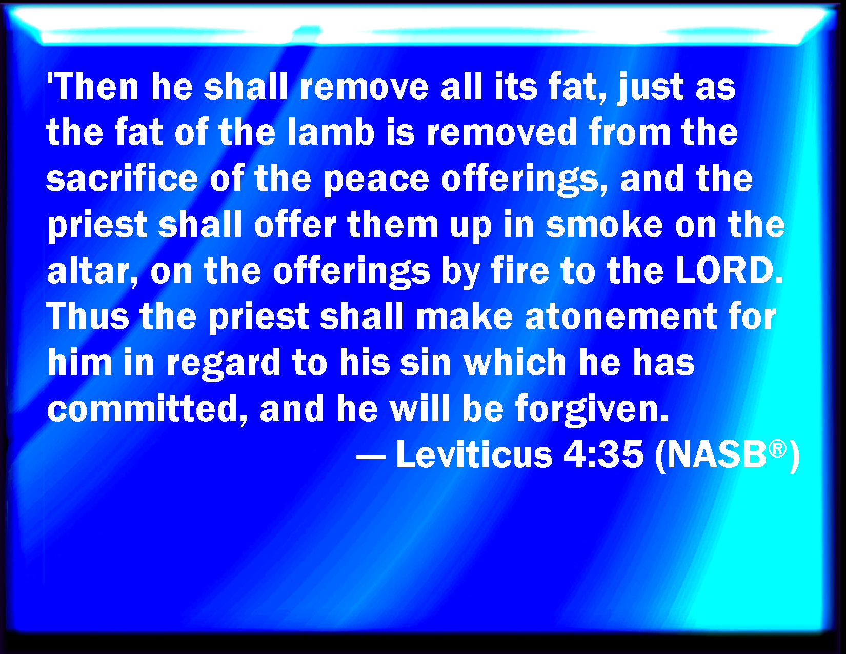 Leviticus 4:35 And he shall take away all the fat thereof, as the fat of the lamb is taken away from the sacrifice of the peace offerings; and the priest shall burn them on the altar, according to the offerings made by fire to the LORD: and the priest shall make an atonement for his sin that he has committed, and it shall be forgiven him.