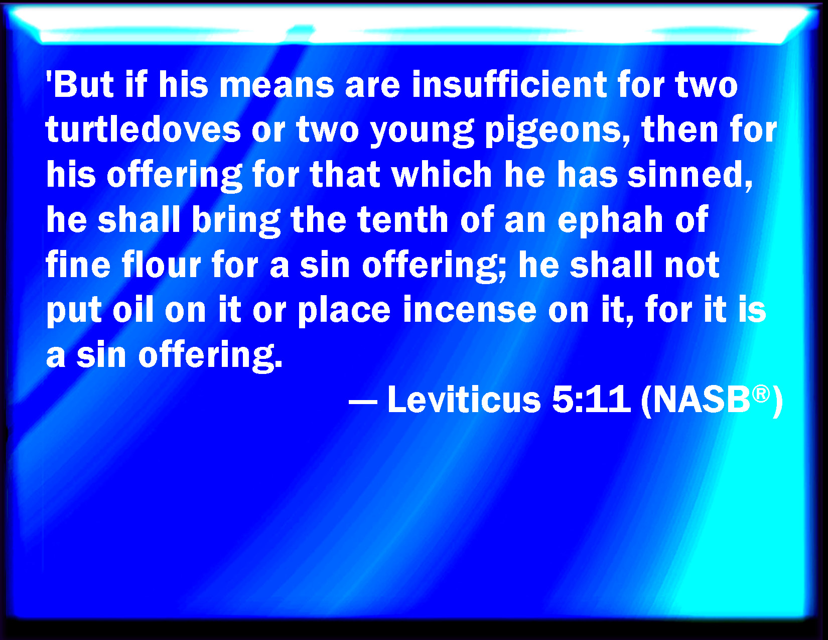 Bible Verse Slide Leviticus 5:11 But if he be not able to bring two turtledoves, or two young pigeons, then he that sinned shall bring for his offering the tenth part of an ephah of fine flour for a sin offering; he shall put no oil on it, neither shall he put any frankincense thereon: for it is a sin offering. KJV: But if he be not able to bring two turtledoves, or two young pigeons, then he that sinned shall bring for his offering the tenth part of an ephah of fine flour for a sin offering; he shall put no oil upon it, neither shall he put any frankincense thereon: for it is a sin offering. DRB: And if his hand be not able to offer two turtles, or two young pigeons, he shall offer for his sin the tenth part of an ephi of flour. He shall not put oil upon it, nor put any frankincense thereon, because it is for sin: DBT: But if his hand cannot attain to two turtle-doves, or two young pigeons, then he that sinned shall bring for his offering the tenth part of an ephah of fine flour for a sin-offering: he shall put no oil on it, neither shall he put frankincense thereon; for it is a sin-offering. ERV: But if his means suffice not for two turtledoves, or two young pigeons, then he shall bring his oblation for that wherein he hath sinned, the tenth part of an ephah of fine flour for a sin offering; he shall put no oil upon it, neither shall he put any frankincense thereon: for it is a sin offering. WBT: But if he shall not be able to bring two turtle-doves, or two young pigeons; then he that sinned shall bring for his offering the tenth part of an ephah of fine flour for a sin-offering; he shall put no oil upon it, neither shall he put any frankincense upon it: for it is a sin-offering. WEB: "'But if he can't afford two turtledoves, or two young pigeons, then he shall bring his offering for that in which he has sinned, the tenth part of an ephah of fine flour for a sin offering. He shall put no oil on it, neither shall he put any frankincense on it, for it is a sin offering. YLT: And if his hand reach not to two turtle-doves, or to two young pigeons, then he hath brought in his offering — he who hath sinned — a tenth of an ephah of flour for a sin-offering; he putteth no oil on it, nor doth he put on it frankincense, for it is a sin-offering,Links Leviticus 5:11 NIV • Leviticus 5:11 NLT • Leviticus 5:11 ESV • Leviticus 5:11 NASB • Leviticus 5:11 KJV • Leviticus 5:11 Interlinear • Leviticus 5:11 Commentaries • Leviticus 5:11 Parallel Texts • Leviticus 5:11 Bible Apps • Leviticus 5:11 Parallel • Bible Hub |