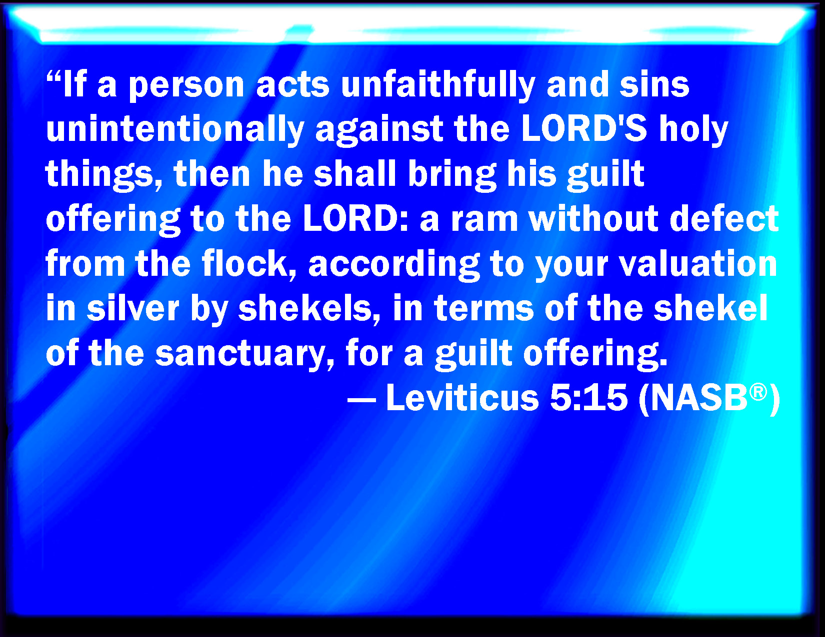 Bible Verse Slide Leviticus 5:15 If a soul commit a trespass, and sin through ignorance, in the holy things of the LORD; then he shall bring for his trespass to the LORD a ram without blemish out of the flocks, with your estimation by shekels of silver, after the shekel of the sanctuary, for a trespass offering. KJV: If a soul commit a trespass, and sin through ignorance, in the holy things of the LORD; then he shall bring for his trespass unto the LORD a ram without blemish out of the flocks, with thy estimation by shekels of silver, after the shekel of the sanctuary, for a trespass offering: DRB: If any one shall sin through mistake, transgressing the ceremonies in those things that are sacrificed to the Lord, he shall offer for his offence a ram without blemish out of the flocks, that may be bought for two sicles, according to the weight of the sanctuary: DBT: If any one act unfaithfully and sin through inadvertence in the holy things of Jehovah, then he shall bring his trespass-offering to Jehovah, a ram without blemish out of the small cattle, according to thy valuation by shekels of silver, according to the shekel of the sanctuary, for a trespass-offering. ERV: If any one commit a trespass, and sin unwittingly, in the holy things of the LORD; then he shall bring his guilt offering unto the LORD, a ram without blemish out of the flock, according to thy estimation in silver by shekels, after the shekel of the sanctuary, for a guilt offering: WBT: If a soul shall commit a trespass, and sin through ignorance, in the holy things of the LORD; then he shall bring for his trespass to the LORD a ram without blemish out of the flocks, with thy estimation by shekels of silver, after the shekel of the sanctuary, for a trespass-offering: WEB: "If anyone commits a trespass, and sins unwittingly, in the holy things of Yahweh; then he shall bring his trespass offering to Yahweh, a ram without blemish from the flock, according to your estimation in silver by shekels, after the shekel of the sanctuary, for a trespass offering. YLT: When a person committeth a trespass, and hath sinned through ignorance against the holy things of Jehovah, then he hath brought in his guilt-offering to Jehovah, a ram, a perfect one, out of the flock, at thy valuation in silver — shekels by the shekel of the sanctuary — for a guilt-offering.Links Leviticus 5:15 NIV • Leviticus 5:15 NLT • Leviticus 5:15 ESV • Leviticus 5:15 NASB • Leviticus 5:15 KJV • Leviticus 5:15 Interlinear • Leviticus 5:15 Commentaries • Leviticus 5:15 Parallel Texts • Leviticus 5:15 Bible Apps • Leviticus 5:15 Parallel • Bible Hub |
