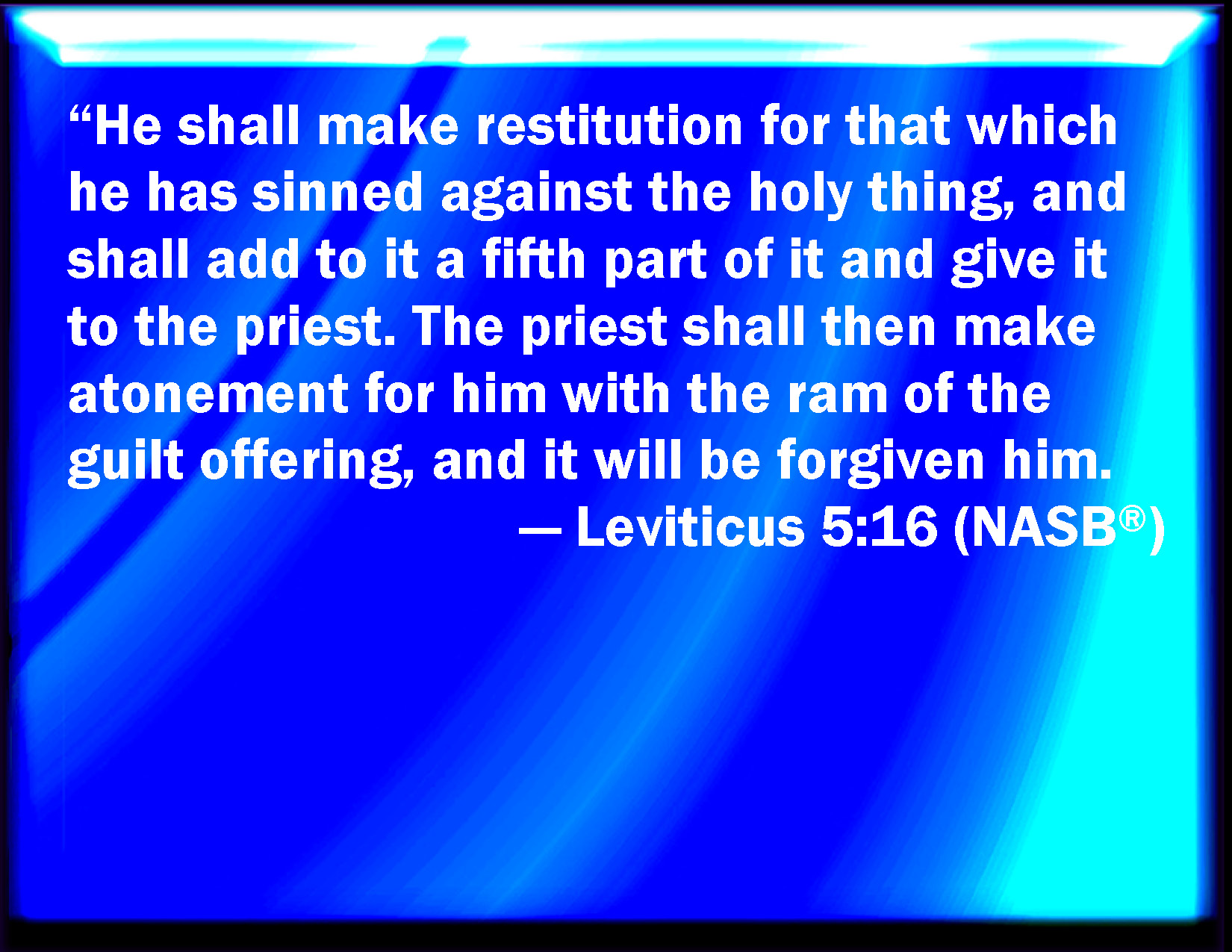 Bible Verse Slide Leviticus 5:16 And he shall make amends for the harm that he has done in the holy thing, and shall add the fifth part thereto, and give it to the priest: and the priest shall make an atonement for him with the ram of the trespass offering, and it shall be forgiven him. KJV: And he shall make amends for the harm that he hath done in the holy thing, and shall add the fifth part thereto, and give it unto the priest: and the priest shall make an atonement for him with the ram of the trespass offering, and it shall be forgiven him. DRB: And he shall make good the damage itself which he hath done, and shall add the fifth part besides, delivering it to the priest, who shall pray for him, offering the ram, and it shall be forgiven him. DBT: And he shall make restitution for the wrong that he hath done in the holy things, and shall add the fifth part thereto, and shall give it unto the priest; and the priest shall make atonement for him with the ram of the trespass-offering, and it shall be forgiven him. ERV: and he shall make restitution for that which he hath done amiss in the holy thing, and shall add the fifth part thereto, and give it unto the priest: and the priest shall make atonement for him with the ram of the guilt offering, and he shall be forgiven. WBT: And he shall make amends for the harm that he hath done in the holy thing, and shall add to it the fifth part, and give it to the priest: and the priest shall make an atonement for him with the ram of the trespass-offering, and it shall be forgiven him. WEB: He shall make restitution for that which he has done wrong in the holy thing, and shall add a fifth part to it, and give it to the priest; and the priest shall make atonement for him with the ram of the trespass offering, and he will be forgiven. YLT: 'And that which he hath sinned against the holy thing he repayeth, and its fifth is adding to it, and hath given it to the priest, and the priest maketh atonement for him with the ram of the guilt-offering, and it hath been forgiven him.Links Leviticus 5:16 NIV • Leviticus 5:16 NLT • Leviticus 5:16 ESV • Leviticus 5:16 NASB • Leviticus 5:16 KJV • Leviticus 5:16 Interlinear • Leviticus 5:16 Commentaries • Leviticus 5:16 Parallel Texts • Leviticus 5:16 Bible Apps • Leviticus 5:16 Parallel • Bible Hub |