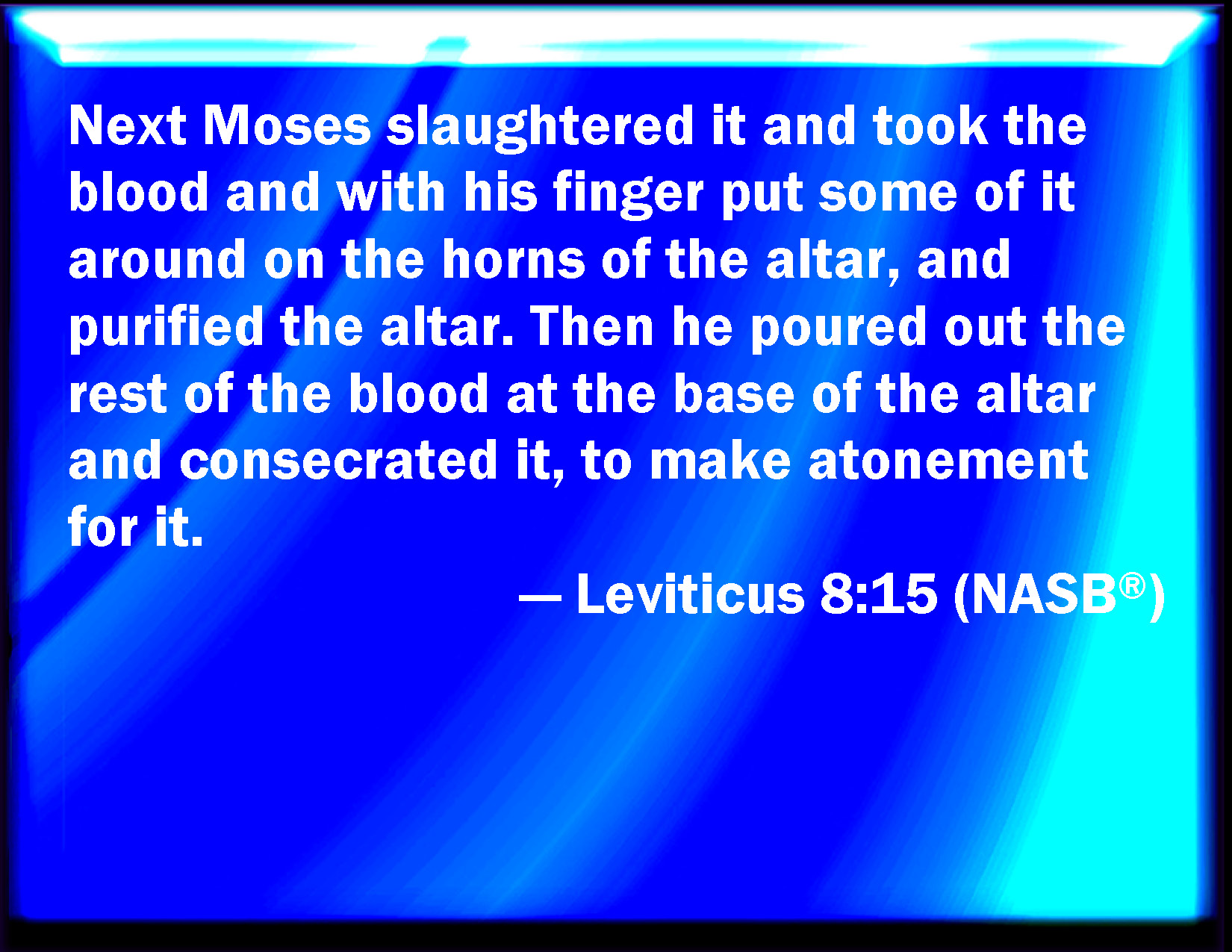Bible Verse Slide Leviticus 8:15 And he slew it; and Moses took the blood, and put it on the horns of the altar round about with his finger, and purified the altar, and poured the blood at the bottom of the altar, and sanctified it, to make reconciliation on it. KJV: And he slew it; and Moses took the blood, and put it upon the horns of the altar round about with his finger, and purified the altar, and poured the blood at the bottom of the altar, and sanctified it, to make reconciliation upon it. DRB: He immolated it: and took the blood, and dipping his finger in it, he touched the horns of the altar round about. Which being expiated, and sanctified, he poured the rest of the blood at the bottom thereof. DBT: and he slaughtered it, and Moses took the blood, and put it on the horns of the altar round about with his finger, and cleansed the altar from sin, and the blood he poured at the bottom of the altar, and hallowed it, making atonement for it. ERV: And he slew it; and Moses took the blood, and put it upon the horns of the altar round about with his finger, and purified the altar, and poured out the blood at the base of the altar, and sanctified it, to make atonement for it. WBT: And he slew it; and Moses took the blood, and put it upon the horns of the altar round about with his finger, and purified the altar, and poured the blood at the bottom of the altar, and sanctified it, to make reconciliation upon it. WEB: He killed it; and Moses took the blood, and put it around on the horns of the altar with his finger, and purified the altar, and poured out the blood at the base of the altar, and sanctified it, to make atonement for it. YLT: and one slaughtereth, and Moses taketh the blood, and putteth on the horns of the altar round about with his finger, and cleanseth the altar, and the blood he hath poured out at the foundation of the altar, and sanctifieth it, to make atonement upon it.Links Leviticus 8:15 NIV • Leviticus 8:15 NLT • Leviticus 8:15 ESV • Leviticus 8:15 NASB • Leviticus 8:15 KJV • Leviticus 8:15 Interlinear • Leviticus 8:15 Commentaries • Leviticus 8:15 Parallel Texts • Leviticus 8:15 Bible Apps • Leviticus 8:15 Parallel • Bible Hub |