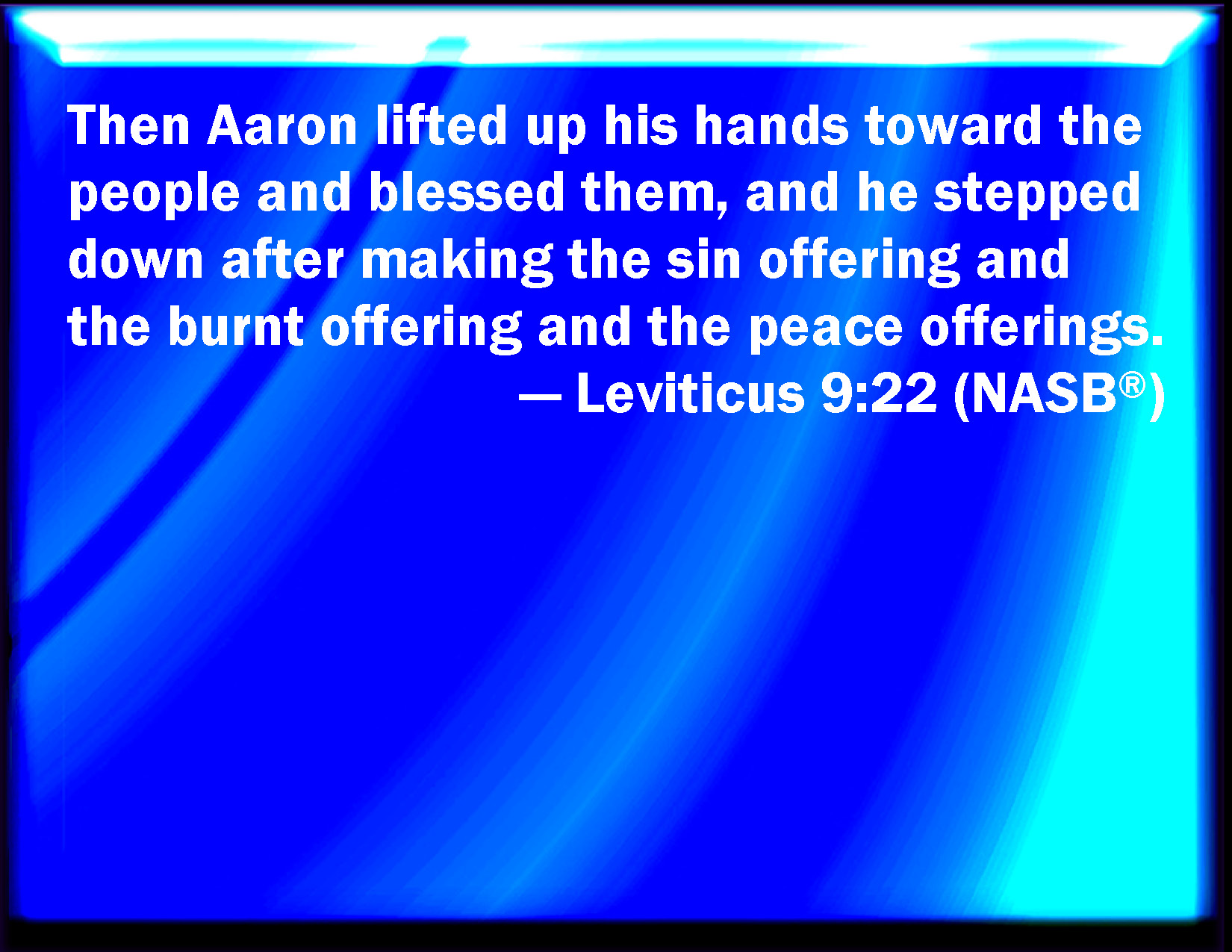 Bible Verse Slide Leviticus 9:22 And Aaron lifted up his hand toward the people, and blessed them, and came down from offering of the sin offering, and the burnt offering, and peace offerings. KJV: And Aaron lifted up his hand toward the people, and blessed them, and came down from offering of the sin offering, and the burnt offering, and peace offerings. DRB: And stretching forth his hands to the people, he blessed them. And so the victims for sin, and the holocausts, and the peace offerings being finished, he came down. DBT: And Aaron lifted up his hands toward the people and blessed them, and came down after the offering of the sin-offering, and the burnt-offering, and the peace-offering. ERV: And Aaron lifted up his hands toward the people, and blessed them; and he came down from offering the sin offering, and the burnt offering, and the peace offerings. WBT: And Aaron lifted up his hand towards the people, and blessed them; and came down from offering the sin-offering, and the burnt-offering, and peace-offerings. WEB: Aaron lifted up his hands toward the people, and blessed them; and he came down from offering the sin offering, and the burnt offering, and the peace offerings. YLT: And Aaron lifteth up his hand towards the people, and blesseth them, and cometh down from making the sin-offering, and the burnt-offering, and the peace-offerings.Links Leviticus 9:22 NIV • Leviticus 9:22 NLT • Leviticus 9:22 ESV • Leviticus 9:22 NASB • Leviticus 9:22 KJV • Leviticus 9:22 Interlinear • Leviticus 9:22 Commentaries • Leviticus 9:22 Parallel Texts • Leviticus 9:22 Bible Apps • Leviticus 9:22 Parallel • Bible Hub |