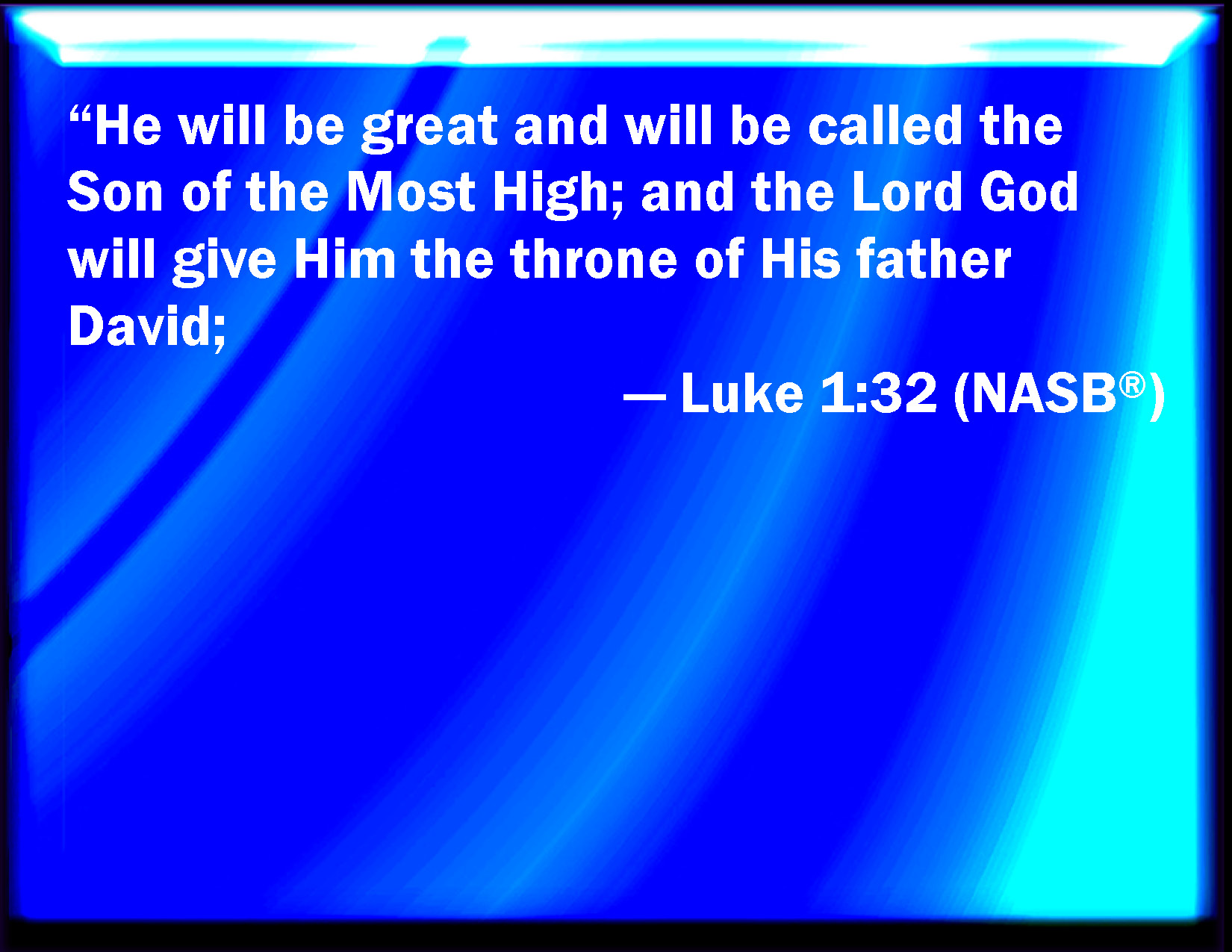 Bible Verse Slide Luke 1:32 He shall be great, and shall be called the Son of the Highest: and the Lord God shall give to him the throne of his father David: KJV: He shall be great, and shall be called the Son of the Highest: and the Lord God shall give unto him the throne of his father David: DRB: He shall be great, and shall be called the Son of the most High; and the Lord God shall give unto him the throne of David his father; and he shall reign in the house of Jacob for ever. DBT: He shall be great, and shall be called Son of the Highest; and the Lord God shall give him the throne of David his father; ERV: He shall be great, and shall be called the Son of the Most High: and the Lord God shall give unto him the throne of his father David: WBT: He will be great, and will be called the Son of the Highest; and the Lord God will give to him the throne of his father David. WEB: He will be great, and will be called the Son of the Most High. The Lord God will give him the throne of his father, David, YLT: he shall be great, and Son of the Highest he shall be called, and the Lord God shall give him the throne of David his father,Links Luke 1:32 NIV • Luke 1:32 NLT • Luke 1:32 ESV • Luke 1:32 NASB • Luke 1:32 KJV • Luke 1:32 Interlinear • Luke 1:32 Commentaries • Luke 1:32 Parallel Texts • Luke 1:32 Bible Apps • Luke 1:32 Parallel • Bible Hub |