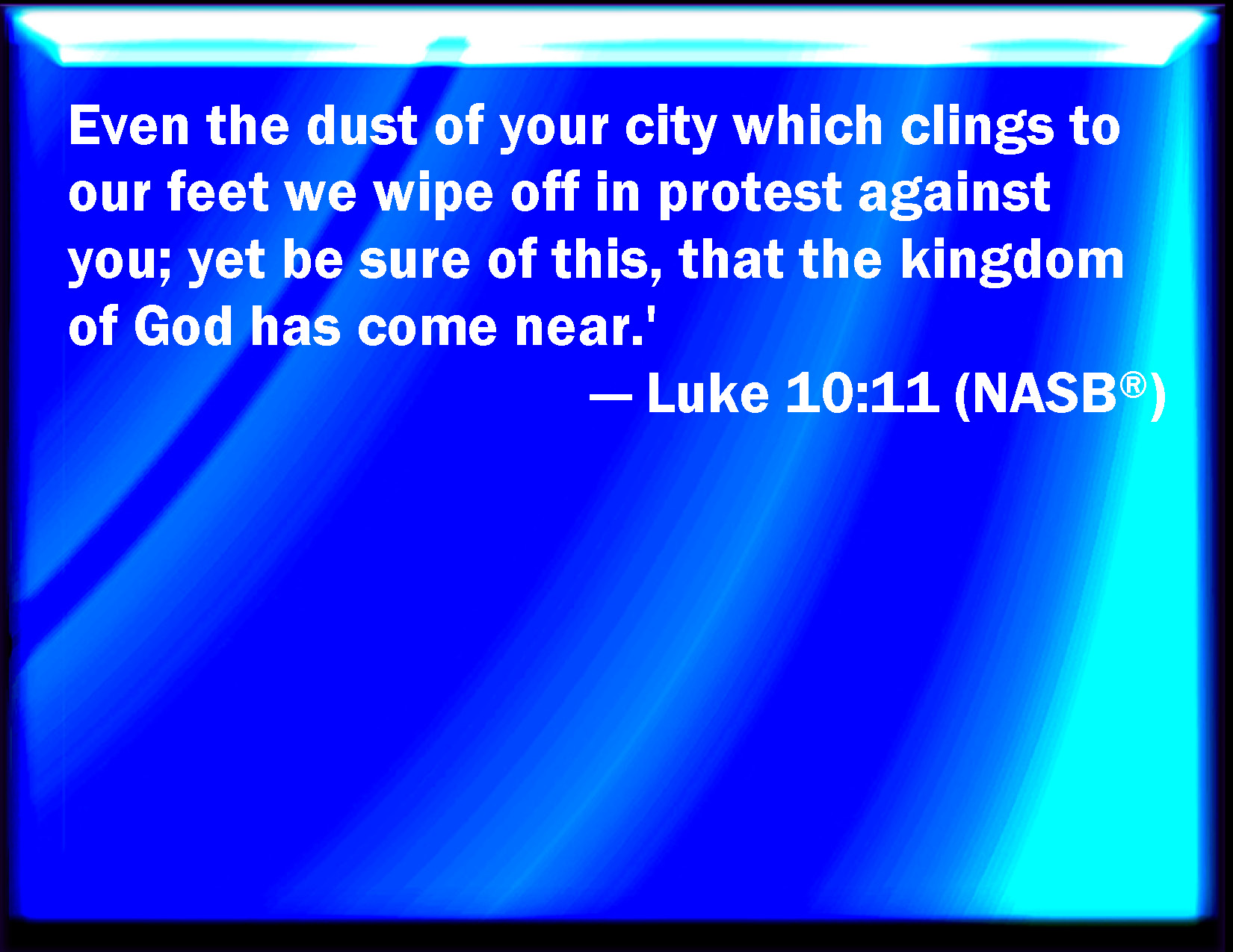 Bible Verse Slide Luke 10:11 Even the very dust of your city, which sticks on us, we do wipe off against you: notwithstanding be you sure of this, that the kingdom of God is come near to you. KJV: Even the very dust of your city, which cleaveth on us, we do wipe off against you: notwithstanding be ye sure of this, that the kingdom of God is come nigh unto you. DRB: Even the very dust of your city that cleaveth to us, we wipe off against you. Yet know this, that the kingdom of God is at hand. DBT: Even the dust of your city, which cleaves to us on the feet, do we shake off against you; but know this, that the kingdom of God is come nigh. ERV: Even the dust from your city, that cleaveth to our feet, we do wipe off against you: howbeit know this, that the kingdom of God is come nigh. WBT: Even the very dust of your city which cleaveth on us, we do wipe off against you: notwithstanding, be ye sure of this, that the kingdom of God is come nigh to you. WEB: 'Even the dust from your city that clings to us, we wipe off against you. Nevertheless know this, that the Kingdom of God has come near to you.' YLT: And the dust that hath cleaved to us, from your city, we do wipe off against you, but this know ye, that the reign of God hath come nigh to you;Links Luke 10:11 NIV • Luke 10:11 NLT • Luke 10:11 ESV • Luke 10:11 NASB • Luke 10:11 KJV • Luke 10:11 Interlinear • Luke 10:11 Commentaries • Luke 10:11 Parallel Texts • Luke 10:11 Bible Apps • Luke 10:11 Parallel • Bible Hub |