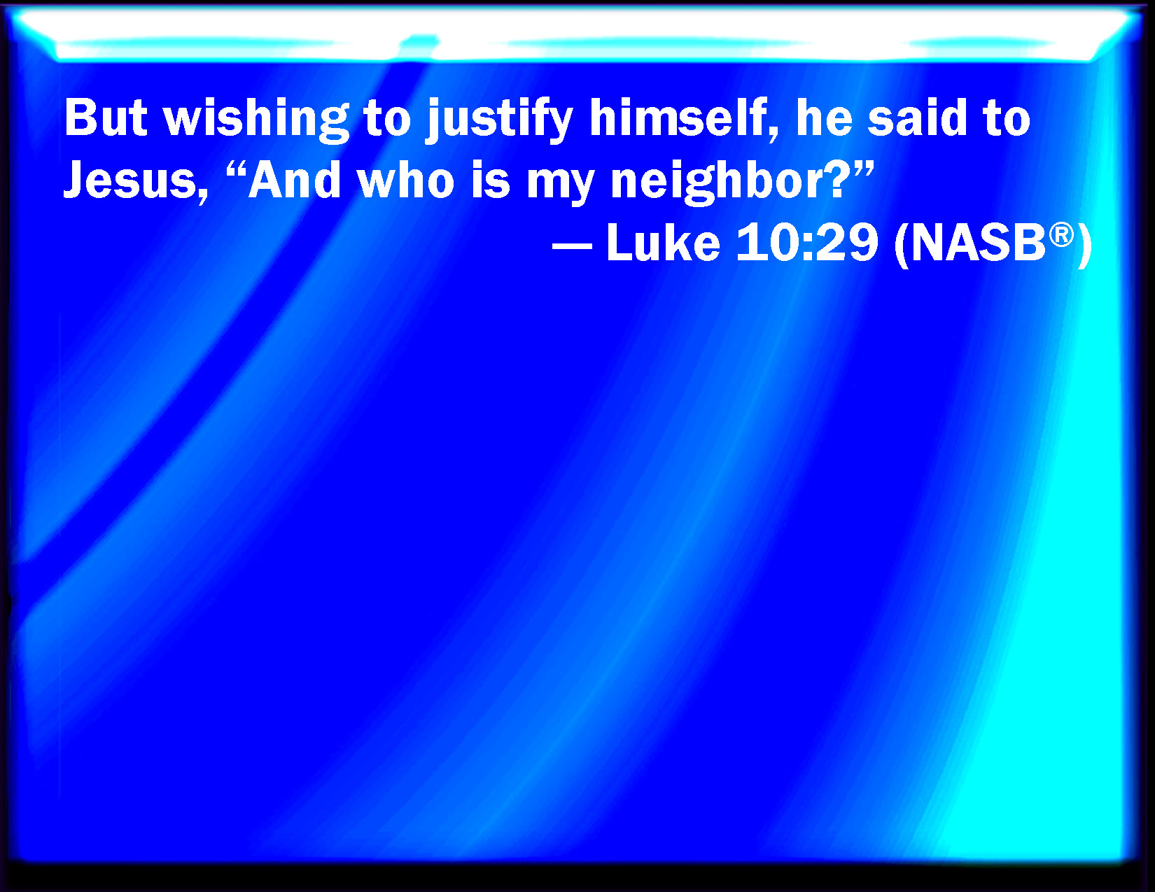 Bible Verse Slide Luke 10:29 But he, willing to justify himself, said to Jesus, And who is my neighbor? KJV: But he, willing to justify himself, said unto Jesus, And who is my neighbour? DRB: But he willing to justify himself, said to Jesus: And who is my neighbour? DBT: But he, desirous of justifying himself, said to Jesus, And who is my neighbour? ERV: But he, desiring to justify himself, said unto Jesus, And who is my neighbour? WBT: But he, willing to justify himself, said to Jesus, And who is my neighbor? WEB: But he, desiring to justify himself, asked Jesus, "Who is my neighbor?" YLT: And he, willing to declare himself righteous, said unto Jesus, 'And who is my neighbour?'Links Luke 10:29 NIV • Luke 10:29 NLT • Luke 10:29 ESV • Luke 10:29 NASB • Luke 10:29 KJV • Luke 10:29 Interlinear • Luke 10:29 Commentaries • Luke 10:29 Parallel Texts • Luke 10:29 Bible Apps • Luke 10:29 Parallel • Bible Hub |