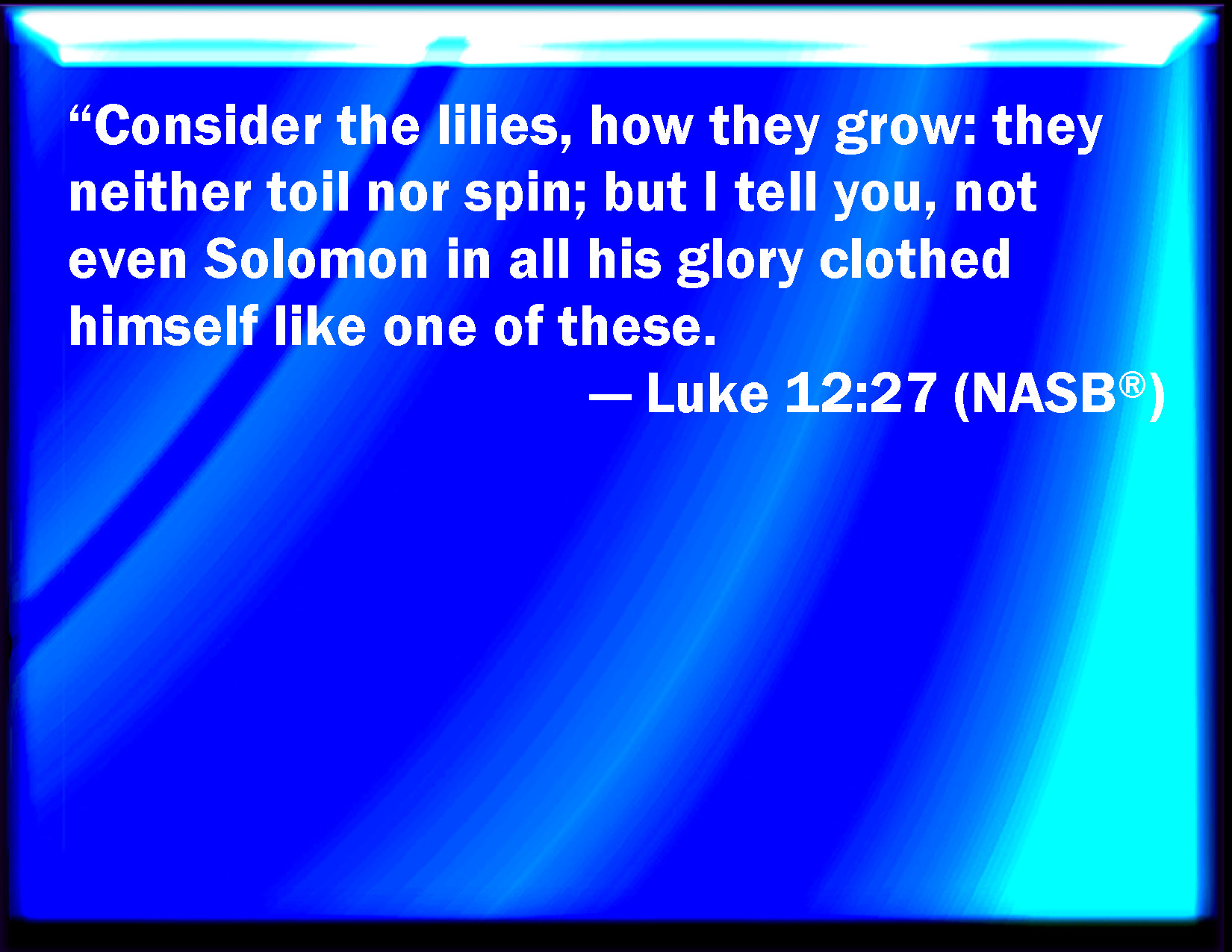 Bible Verse Slide Luke 12:27 Consider the lilies how they grow: they toil not, they spin not; and yet I say to you, that Solomon in all his glory was not arrayed like one of these. KJV: Consider the lilies how they grow: they toil not, they spin not; and yet I say unto you, that Solomon in all his glory was not arrayed like one of these. DRB: Consider the lilies, how they grow: they labour not, neither do they spin. But I say to you, not even Solomon in all his glory was clothed like one of these. DBT: Consider the lilies how they grow: they neither toil nor spin; but I say unto you, Not even Solomon in all his glory was clothed as one of these. ERV: Consider the lilies, how they grow: they toil not, neither do they spin; yet I say unto you, Even Solomon in all his glory was not arrayed like one of these. WBT: Consider the lilies how they grow: They toil not, they spin not; and yet I say to you, that Solomon in all his glory was not arrayed like one of these. WEB: Consider the lilies, how they grow. They don't toil, neither do they spin; yet I tell you, even Solomon in all his glory was not arrayed like one of these. YLT: 'Consider the lilies, how do they grow? they labour not, nor do they spin, and I say to you, not even Solomon in all his glory was arrayed as one of these;Links Luke 12:27 NIV • Luke 12:27 NLT • Luke 12:27 ESV • Luke 12:27 NASB • Luke 12:27 KJV • Luke 12:27 Interlinear • Luke 12:27 Commentaries • Luke 12:27 Parallel Texts • Luke 12:27 Bible Apps • Luke 12:27 Parallel • Bible Hub |