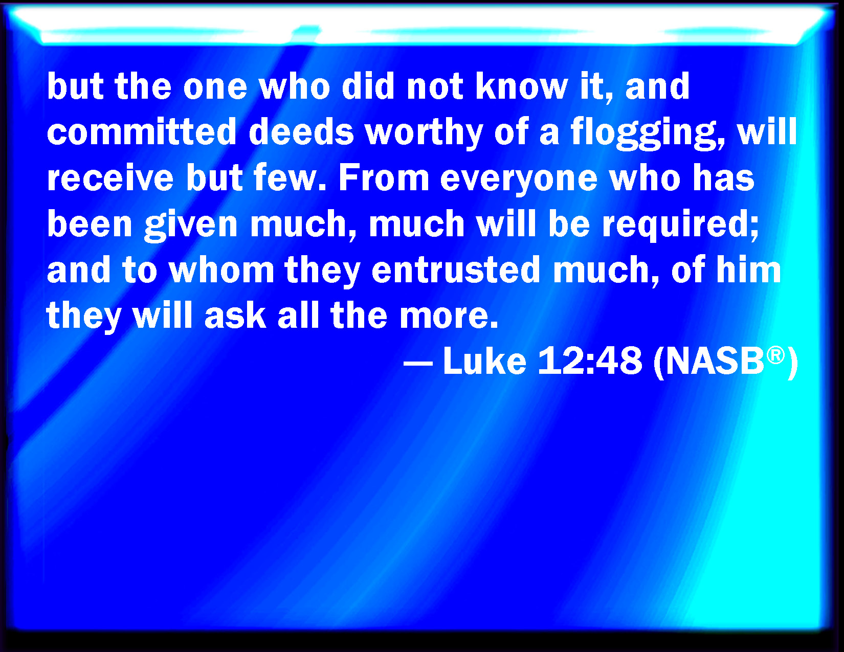 Bible Verse Slide Luke 12:48 But he that knew not, and did commit things worthy of stripes, shall be beaten with few stripes. For to whomsoever much is given, of him shall be much required: and to whom men have committed much, of him they will ask the more. KJV: But he that knew not, and did commit things worthy of stripes, shall be beaten with few stripes. For unto whomsoever much is given, of him shall be much required: and to whom men have committed much, of him they will ask the more. DRB: But he that knew not, and did things worthy of stripes, shall be beaten with few stripes. And unto whomsoever much is given, of him much shall be required: and to whom they have committed much, of him they will demand the more. DBT: but he who knew it not, and did things worthy of stripes, shall be beaten with few. And to every one to whom much has been given, much shall be required from him; and to whom men have committed much, they will ask from him the more. ERV: but he that knew not, and did things worthy of stripes, shall be beaten with few stripes. And to whomsoever much is given, of him shall much be required: and to whom they commit much, of him will they ask the more. WBT: But he that knew not, and committed things worthy of stripes, shall be beaten with few stripes. For to whomsoever much is given, of him shall much be required: and to whom men have committed much, from him they will ask the more. WEB: but he who didn't know, and did things worthy of stripes, will be beaten with few stripes. To whoever much is given, of him will much be required; and to whom much was entrusted, of him more will be asked. YLT: and he who, not having known, and having done things worthy of stripes, shall be beaten with few; and to every one to whom much was given, much shall be required from him; and to whom they did commit much, more abundantly they will ask of him.Links Luke 12:48 NIV • Luke 12:48 NLT • Luke 12:48 ESV • Luke 12:48 NASB • Luke 12:48 KJV • Luke 12:48 Interlinear • Luke 12:48 Commentaries • Luke 12:48 Parallel Texts • Luke 12:48 Bible Apps • Luke 12:48 Parallel • Bible Hub |