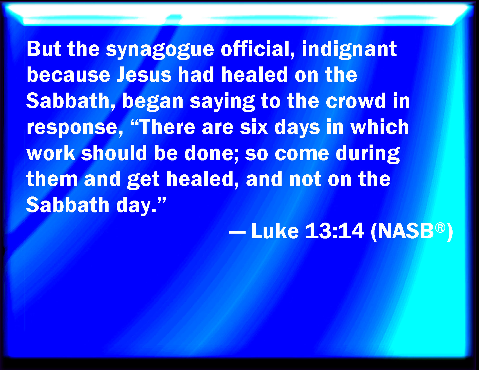 Bible Verse Slide Luke 13:14 And the ruler of the synagogue answered with indignation, because that Jesus had healed on the sabbath day, and said to the people, There are six days in which men ought to work: in them therefore come and be healed, and not on the sabbath day. KJV: And the ruler of the synagogue answered with indignation, because that Jesus had healed on the sabbath day, and said unto the people, There are six days in which men ought to work: in them therefore come and be healed, and not on the sabbath day. DRB: And the ruler of the synagogue (being angry that Jesus had healed on the sabbath) answering, said to the multitude: Six days there are wherein you ought to work. In them therefore come, and be healed; and not on the sabbath day. DBT: But the ruler of the synagogue, indignant because Jesus healed on the sabbath, answering said to the crowd, There are six days in which people ought to work; in these therefore come and be healed, and not on the sabbath day. ERV: And the ruler of the synagogue, being moved with indignation because Jesus had healed on the sabbath, answered and said to the multitude, There are six days in which men ought to work: in them therefore come and be healed, and not on the day of the sabbath. WBT: And the ruler of the synagogue answered with indignation, because Jesus had healed on the sabbath, and said to the people, There are six days in which men ought to work: in them therefore come and be healed, and not on the sabbath. WEB: The ruler of the synagogue, being indignant because Jesus had healed on the Sabbath, said to the multitude, "There are six days in which men ought to work. Therefore come on those days and be healed, and not on the Sabbath day!" YLT: And the chief of the synagogue answering — much displeased that on the sabbath Jesus healed — said to the multitude, 'Six days there are in which it behoveth us to be working; in these, then, coming, be healed, and not on the sabbath-day.'Links Luke 13:14 NIV • Luke 13:14 NLT • Luke 13:14 ESV • Luke 13:14 NASB • Luke 13:14 KJV • Luke 13:14 Interlinear • Luke 13:14 Commentaries • Luke 13:14 Parallel Texts • Luke 13:14 Bible Apps • Luke 13:14 Parallel • Bible Hub |