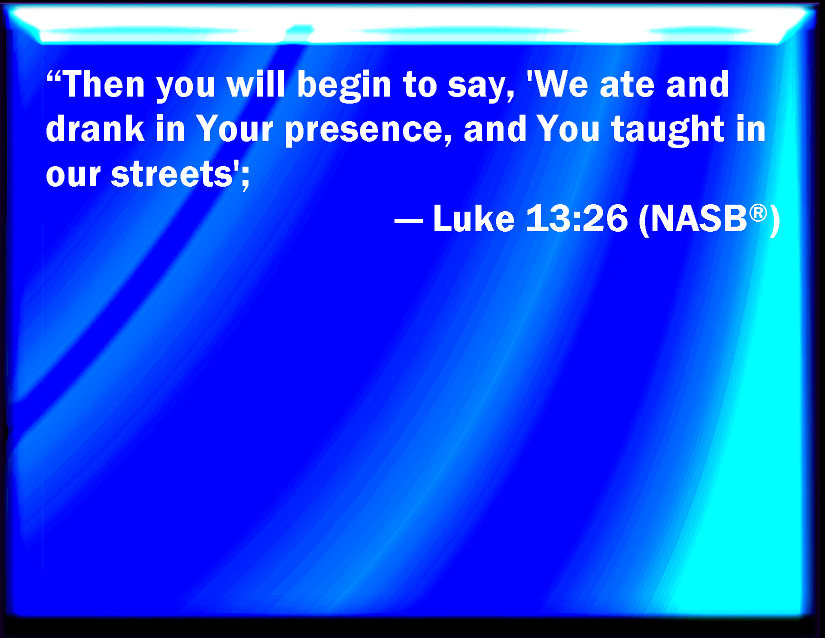 Bible Verse Slide Luke 13:26 Then shall you begin to say, We have eaten and drunk in your presence, and you have taught in our streets. KJV: Then shall ye begin to say, We have eaten and drunk in thy presence, and thou hast taught in our streets. DRB: Then you shall begin to say: We have eaten and drunk in thy presence, and thou hast taught in our streets. DBT: then shall ye begin to say, We have eaten in thy presence and drunk, and thou hast taught in our streets; ERV: then shall ye begin to say, We did eat and drink in thy presence, and thou didst teach in our streets; WBT: Then ye will begin to say, We have eaten and drank in thy presence, and thou hast taught in our streets. WEB: Then you will begin to say, 'We ate and drank in your presence, and you taught in our streets.' YLT: then ye may begin to say, We did eat before thee, and did drink, and in our broad places thou didst teach;Links Luke 13:26 NIV • Luke 13:26 NLT • Luke 13:26 ESV • Luke 13:26 NASB • Luke 13:26 KJV • Luke 13:26 Interlinear • Luke 13:26 Commentaries • Luke 13:26 Parallel Texts • Luke 13:26 Bible Apps • Luke 13:26 Parallel • Bible Hub |