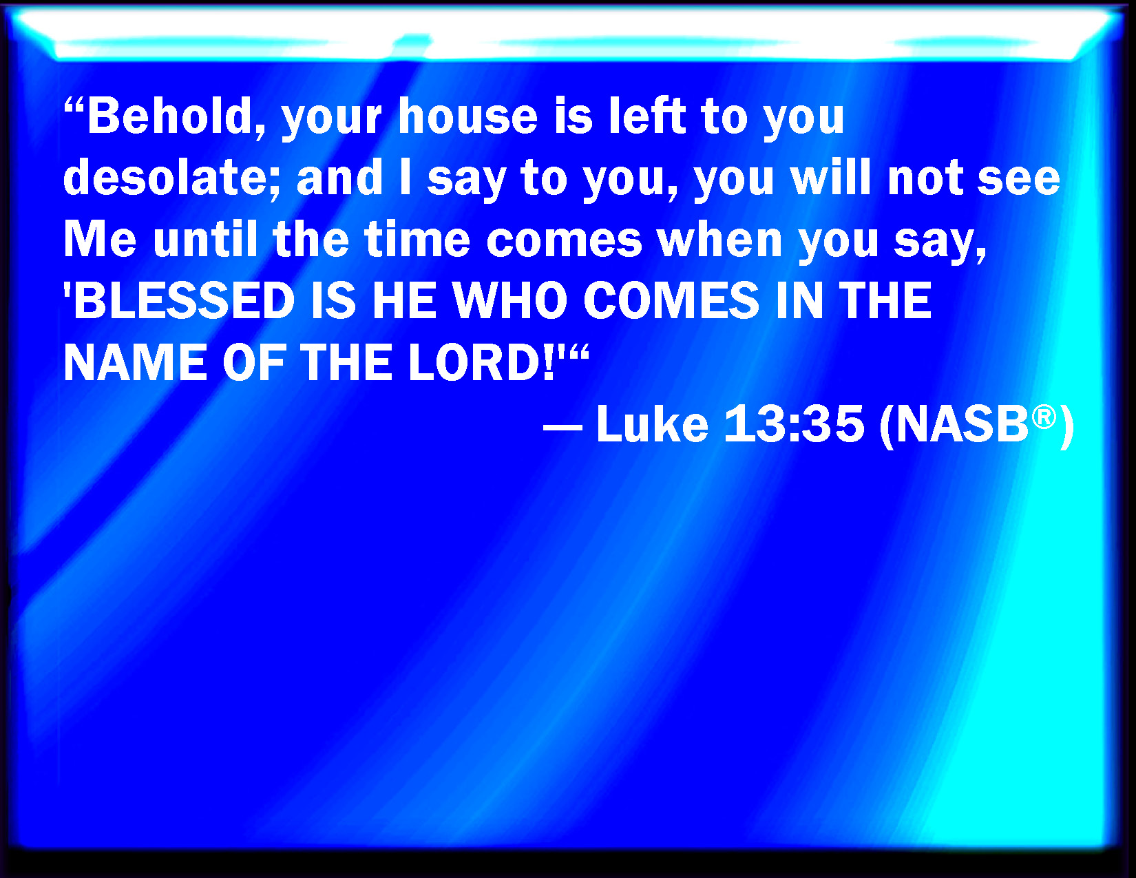 Bible Verse Slide Luke 13:35 Behold, your house is left to you desolate: and truly I say to you, You shall not see me, until the time come when you shall say, Blessed is he that comes in the name of the Lord. KJV: Behold, your house is left unto you desolate: and verily I say unto you, Ye shall not see me, until the time come when ye shall say, Blessed is he that cometh in the name of the Lord. DRB: Behold your house shall be left to you desolate. And I say to you, that you shall not see me till the time come, when you shall say: Blessed is he that cometh in the name of the Lord. DBT: Behold, your house is left unto you; and I say unto you, that ye shall not see me until it come that ye say, Blessed is he that comes in the name of the Lord. ERV: Behold, your house is left unto you desolate: and I say unto you, Ye shall not see me, until ye shall say, Blessed is he that cometh in the name of the Lord. WBT: Behold, your house is left to you desolate. And verily I say to you, ye shall not see me, until the time shall come when ye shall say, Blessed is he that cometh in the name of the Lord. WEB: Behold, your house is left to you desolate. I tell you, you will not see me, until you say, 'Blessed is he who comes in the name of the Lord!'" YLT: Lo, your house is being left to you desolate, and verily I say to you — ye may not see me, till it may come, when ye may say, Blessed is he who is coming in the name of the Lord.'Links Luke 13:35 NIV • Luke 13:35 NLT • Luke 13:35 ESV • Luke 13:35 NASB • Luke 13:35 KJV • Luke 13:35 Interlinear • Luke 13:35 Commentaries • Luke 13:35 Parallel Texts • Luke 13:35 Bible Apps • Luke 13:35 Parallel • Bible Hub |