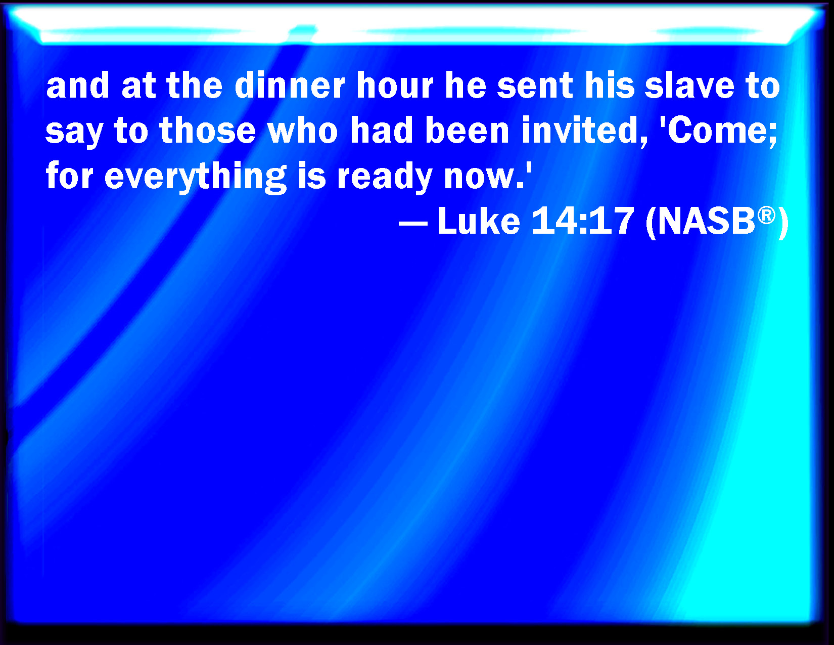 Bible Verse Slide Luke 14:17 And sent his servant at supper time to say to them that were bidden, Come; for all things are now ready. KJV: And sent his servant at supper time to say to them that were bidden, Come; for all things are now ready. DRB: And he sent his servant at the hour of supper to say to them that were invited, that they should come, for now all things are ready. DBT: And he sent his bondman at the hour of supper to say to those who were invited, Come, for already all things are ready. ERV: and he sent forth his servant at supper time to say to them that were bidden, Come; for all things are now ready. WBT: And sent his servant at supper-time, to say to them that were invited, Come, for all things are now ready. WEB: He sent out his servant at supper time to tell those who were invited, 'Come, for everything is ready now.' YLT: and he sent his servant at the hour of the supper to say to those having been called, Be coming, because now are all things ready.Links Luke 14:17 NIV • Luke 14:17 NLT • Luke 14:17 ESV • Luke 14:17 NASB • Luke 14:17 KJV • Luke 14:17 Interlinear • Luke 14:17 Commentaries • Luke 14:17 Parallel Texts • Luke 14:17 Bible Apps • Luke 14:17 Parallel • Bible Hub |