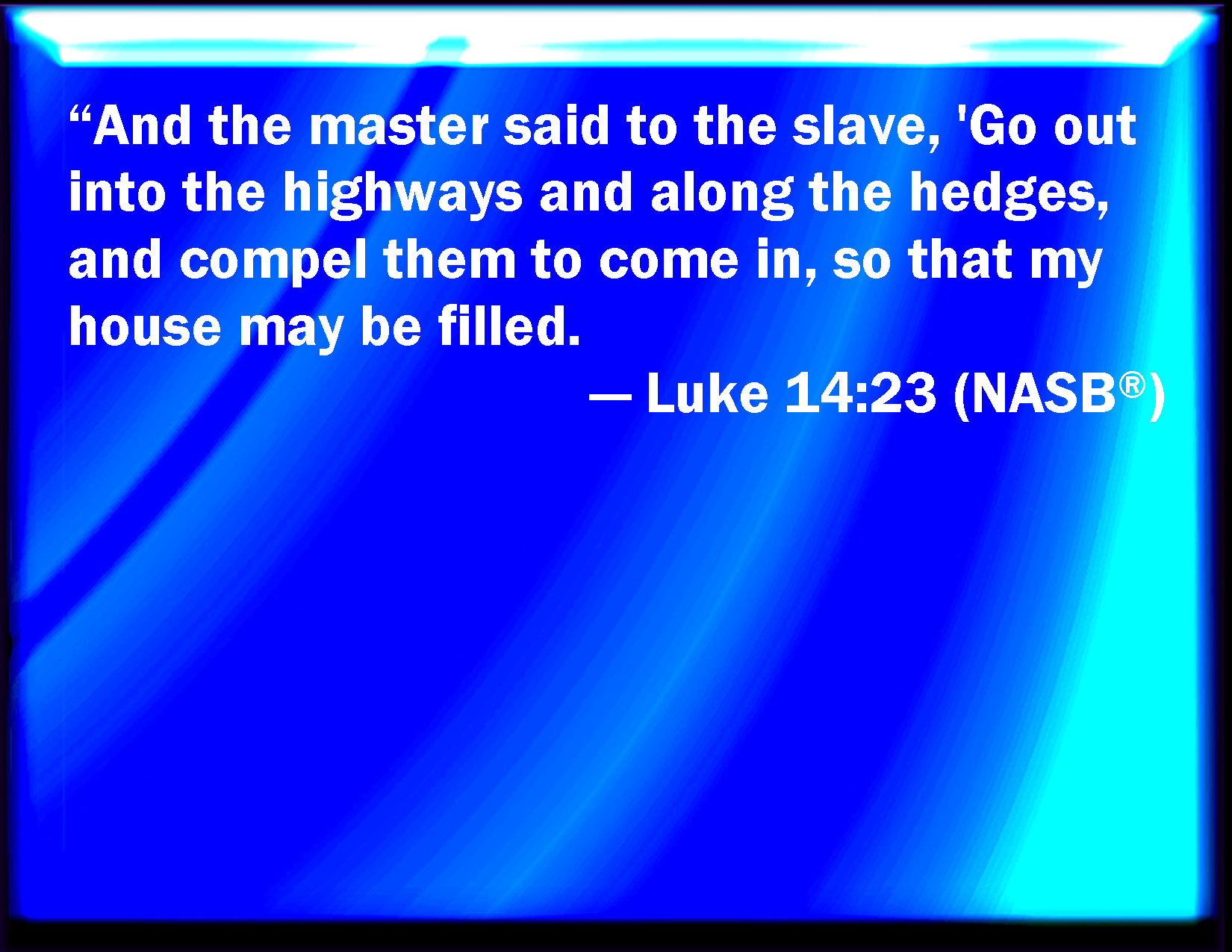 Bible Verse Slide Luke 14:23 And the lord said to the servant, Go out into the highways and hedges, and compel them to come in, that my house may be filled. KJV: And the lord said unto the servant, Go out into the highways and hedges, and compel them to come in, that my house may be filled. DRB: And the Lord said to the servant: Go out into the highways and hedges, and compel them to come in, that my house may be filled. DBT: And the lord said to the bondman, Go out into the ways and fences and compel to come in, that my house may be filled; ERV: And the lord said unto the servant, Go out into the highways and hedges, and constrain them to come in, that my house may be filled. WBT: And the lord said to the servant, Go out into the highways and hedges, and compel them to come in, that my house may be filled. WEB: "The lord said to the servant, 'Go out into the highways and hedges, and compel them to come in, that my house may be filled. YLT: 'And the lord said unto the servant, Go forth to the ways and hedges, and constrain to come in, that my house may be filled;Links Luke 14:23 NIV • Luke 14:23 NLT • Luke 14:23 ESV • Luke 14:23 NASB • Luke 14:23 KJV • Luke 14:23 Interlinear • Luke 14:23 Commentaries • Luke 14:23 Parallel Texts • Luke 14:23 Bible Apps • Luke 14:23 Parallel • Bible Hub |
