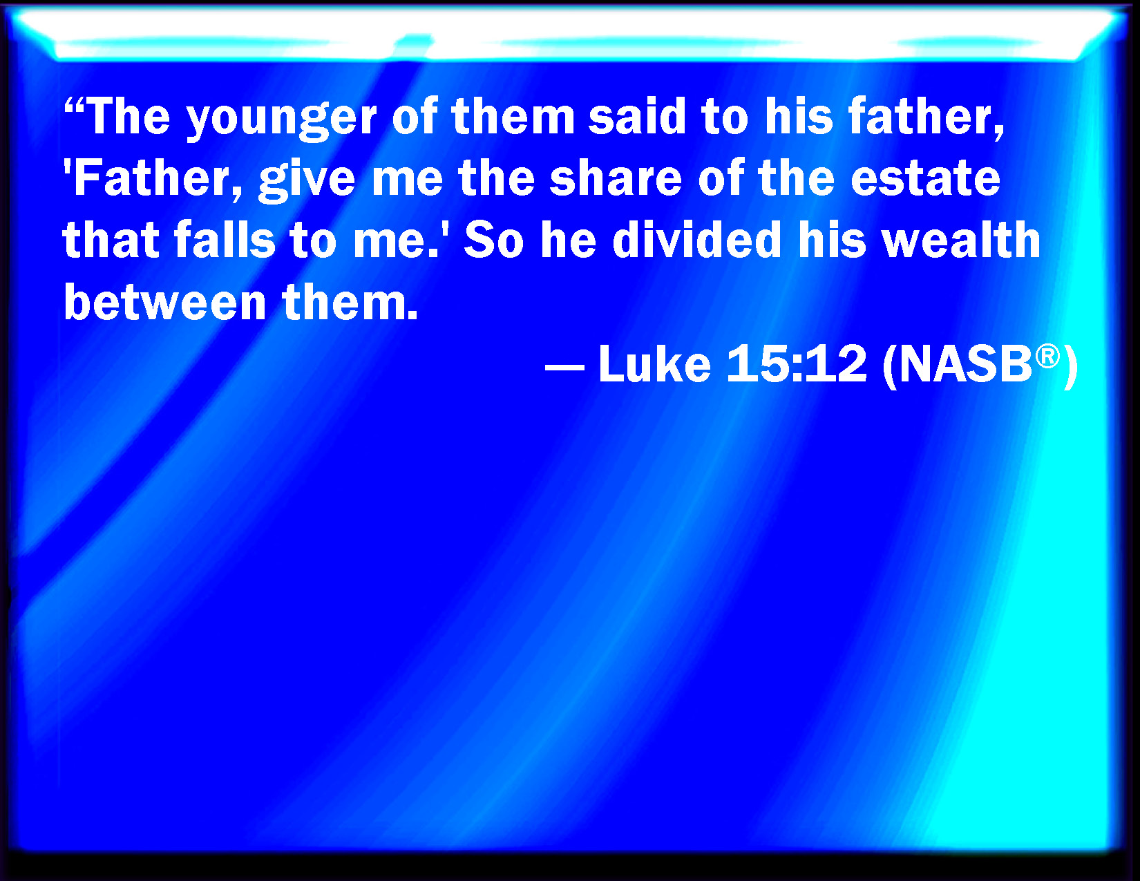 Bible Verse Slide Luke 15:12 And the younger of them said to his father, Father, give me the portion of goods that falls to me. And he divided to them his living. KJV: And the younger of them said to his father, Father, give me the portion of goods that falleth to me. And he divided unto them his living. DRB: And the younger of them said to his father: Father, give me the portion of substance that falleth to me. And he divided unto them his substance. DBT: and the younger of them said to his father, Father, give to me the share of the property that falls to me. And he divided to them what he was possessed of. ERV: and the younger of them said to his father, Father, give me the portion of thy substance that falleth to me. And he divided unto them his living. WBT: And the younger of them said to his father, Father, give me the portion of goods that falleth to me. And he divided to them his living. WEB: The younger of them said to his father, 'Father, give me my share of your property.' He divided his livelihood between them. YLT: and the younger of them said to the father, Father, give me the portion of the substance falling to me, and he divided to them the living.Links Luke 15:12 NIV • Luke 15:12 NLT • Luke 15:12 ESV • Luke 15:12 NASB • Luke 15:12 KJV • Luke 15:12 Interlinear • Luke 15:12 Commentaries • Luke 15:12 Parallel Texts • Luke 15:12 Bible Apps • Luke 15:12 Parallel • Bible Hub |