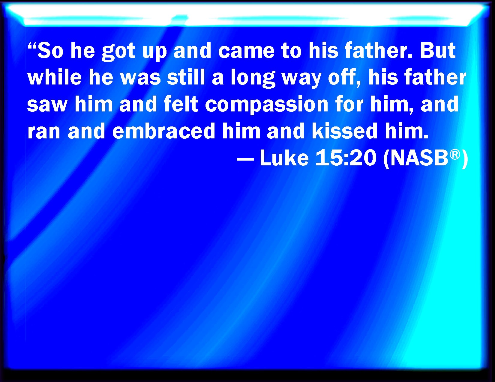 Bible Verse Slide Luke 15:20 And he arose, and came to his father. But when he was yet a great way off, his father saw him, and had compassion, and ran, and fell on his neck, and kissed him. KJV: And he arose, and came to his father. But when he was yet a great way off, his father saw him, and had compassion, and ran, and fell on his neck, and kissed him. DRB: And rising up he came to his father. And when he was yet a great way off, his father saw him, and was moved with compassion, and running to him fell upon his neck, and kissed him. DBT: And he rose up and went to his own father. But while he was yet a long way off, his father saw him, and was moved with compassion, and ran, and fell upon his neck, and covered him with kisses. ERV: And he arose, and came to his father. But while he was yet afar off, his father saw him, and was moved with compassion, and ran, and fell on his neck, and kissed him. WBT: And he arose, and came to his father. But when he was yet a great way off, his father saw him, and had compassion, and ran, and fell on his neck, and kissed him. WEB: "He arose, and came to his father. But while he was still far off, his father saw him, and was moved with compassion, and ran, and fell on his neck, and kissed him. YLT: 'And having risen, he went unto his own father, and he being yet far distant, his father saw him, and was moved with compassion, and having ran he fell upon his neck and kissed him;Links Luke 15:20 NIV • Luke 15:20 NLT • Luke 15:20 ESV • Luke 15:20 NASB • Luke 15:20 KJV • Luke 15:20 Interlinear • Luke 15:20 Commentaries • Luke 15:20 Parallel Texts • Luke 15:20 Bible Apps • Luke 15:20 Parallel • Bible Hub |