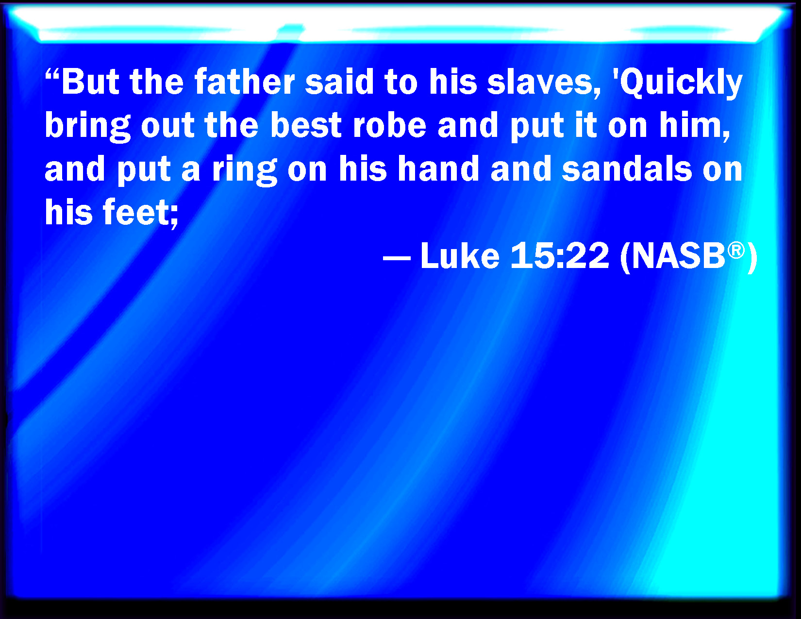 Bible Verse Slide Luke 15:22 But the father said to his servants, Bring forth the best robe, and put it on him; and put a ring on his hand, and shoes on his feet: KJV: But the father said to his servants, Bring forth the best robe, and put it on him; and put a ring on his hand, and shoes on his feet: DRB: And the father said to his servants: Bring forth quickly the first robe, and put it on him, and put a ring on his hand, and shoes on his feet: DBT: But the father said to his bondmen, Bring out the best robe and clothe him in it, and put a ring on his hand and sandals on his feet; ERV: But the father said to his servants, Bring forth quickly the best robe, and put it on him; and put a ring on his hand, and shoes on his feet: WBT: But the father said to his servants, Bring forth the best robe, and put it on him, and put a ring on his hand, and shoes on his feet: WEB: "But the father said to his servants, 'Bring out the best robe, and put it on him. Put a ring on his hand, and shoes on his feet. YLT: 'And the father said unto his servants, Bring forth the first robe, and clothe him, and give a ring for his hand, and sandals for the feet;Links Luke 15:22 NIV • Luke 15:22 NLT • Luke 15:22 ESV • Luke 15:22 NASB • Luke 15:22 KJV • Luke 15:22 Interlinear • Luke 15:22 Commentaries • Luke 15:22 Parallel Texts • Luke 15:22 Bible Apps • Luke 15:22 Parallel • Bible Hub |