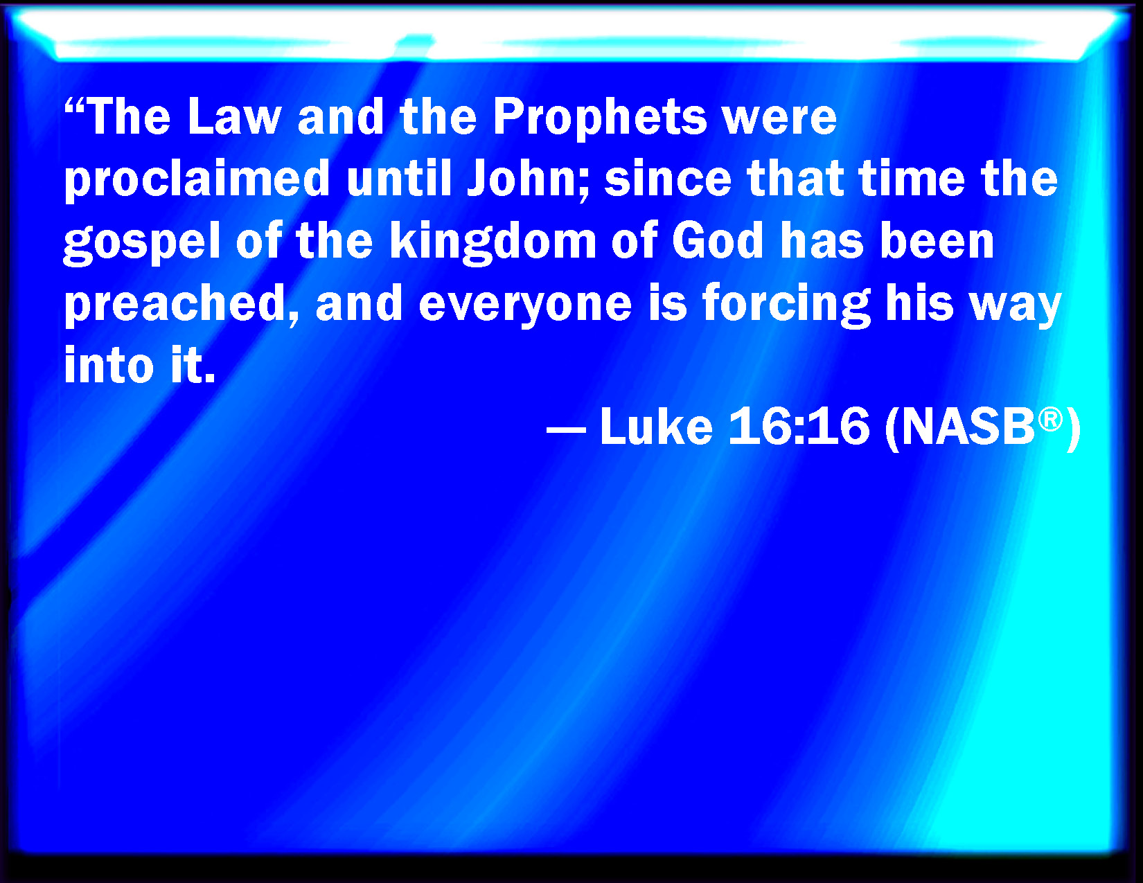 Luke 16:16 The law and the prophets were until John: since that time the kingdom of God is preached, and every man presses into it.