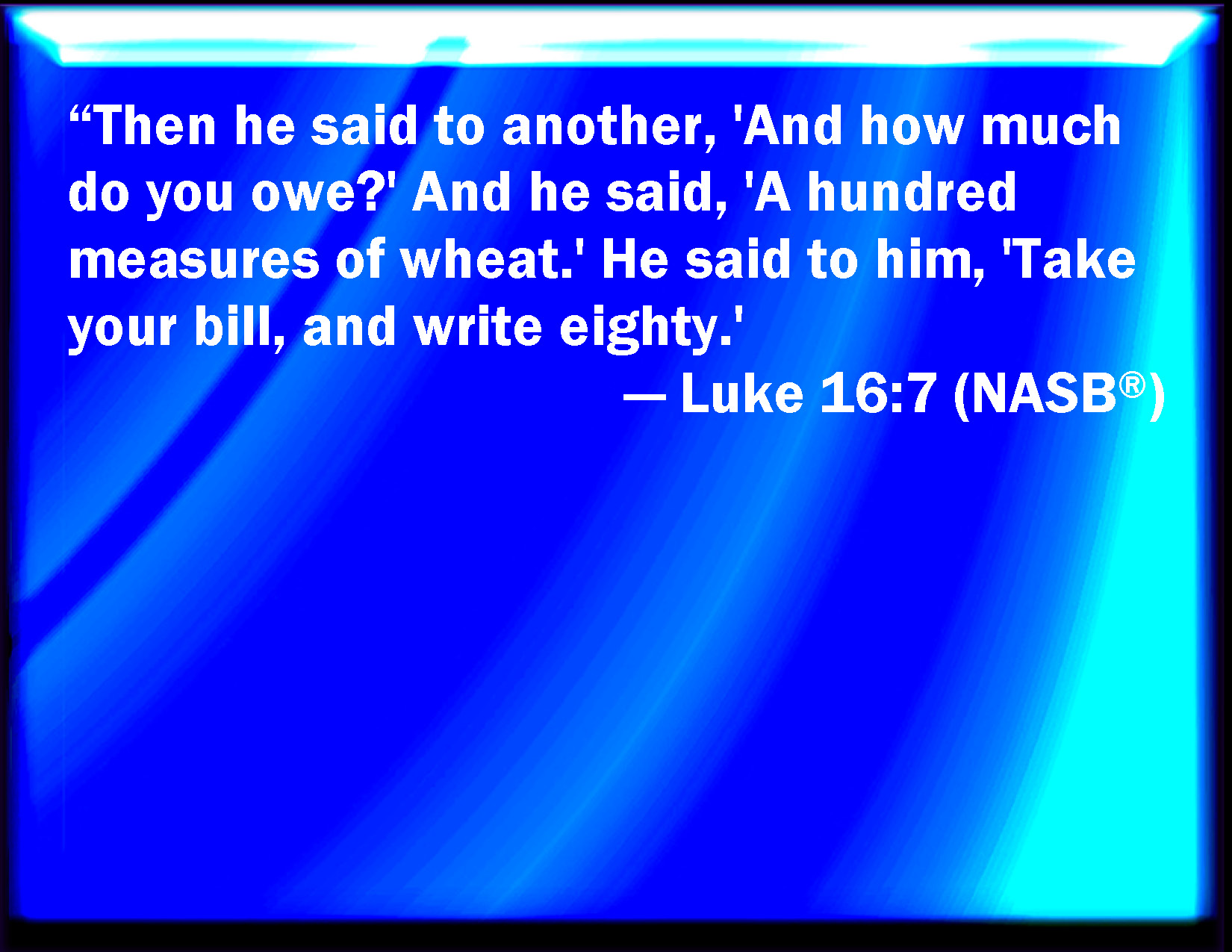 Bible Verse Slide Luke 16:7 Then said he to another, And how much owe you? And he said, An hundred measures of wheat. And he said to him, Take your bill, and write fourscore. KJV: Then said he to another, And how much owest thou? And he said, An hundred measures of wheat. And he said unto him, Take thy bill, and write fourscore. DRB: Then he said to another: And how much dost thou owe? Who said: An hundred quarters of wheat. He said to him: Take thy bill, and write eighty. DBT: Then he said to another, And thou, how much dost thou owe? And he said, A hundred cors of wheat. And he says to him, Take thy writing and write eighty. ERV: Then said he to another, And how much owest thou? And he said, A hundred measures of wheat. He saith unto him, Take thy bond, and write fourscore. WBT: Then said he to another, And how much owest thou? And he said, A hundred measures of wheat. And he said to him, Take thy bill, and write eighty. WEB: Then he said to another, 'How much do you owe?' He said, 'A hundred cors of wheat.' He said to him, 'Take your bill, and write eighty.' YLT: 'Afterward to another he said, And thou, how much dost thou owe? and he said, A hundred cors of wheat; and he saith to him, Take thy bill, and write eighty.Links Luke 16:7 NIV • Luke 16:7 NLT • Luke 16:7 ESV • Luke 16:7 NASB • Luke 16:7 KJV • Luke 16:7 Interlinear • Luke 16:7 Commentaries • Luke 16:7 Parallel Texts • Luke 16:7 Bible Apps • Luke 16:7 Parallel • Bible Hub |