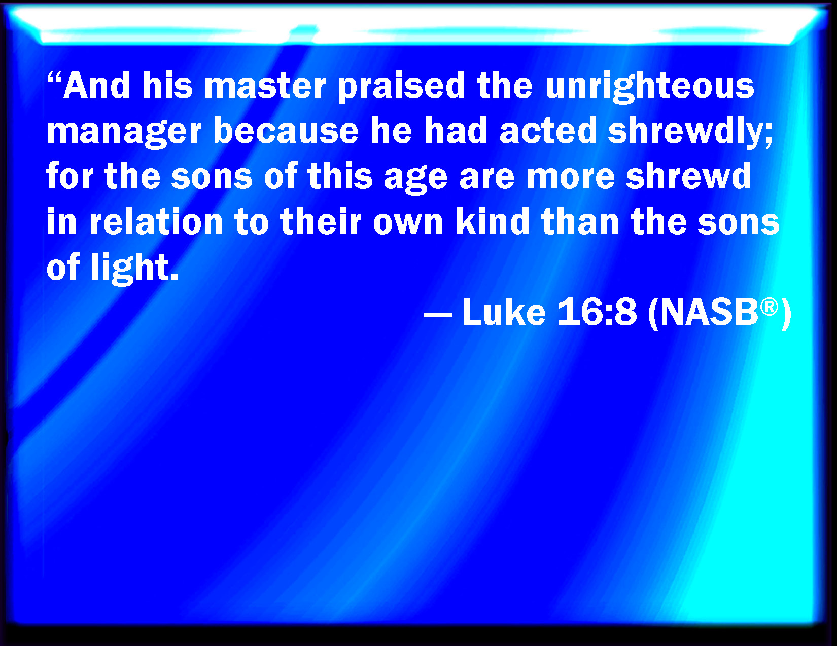 Bible Verse Slide Luke 16:8 And the lord commended the unjust steward, because he had done wisely: for the children of this world are in their generation wiser than the children of light. KJV: And the lord commended the unjust steward, because he had done wisely: for the children of this world are in their generation wiser than the children of light. DRB: And the lord commended the unjust steward, forasmuch as he had done wisely: for the children of this world are wiser in their generation than the children of light. DBT: And the lord praised the unrighteous steward because he had done prudently. For the sons of this world are, for their own generation, more prudent than the sons of light. ERV: And his lord commended the unrighteous steward because he had done wisely: for the sons of this world are for their own generation wiser than the sons of the light. WBT: And the lord commended the unjust steward, because he had done wisely: for the children of this world are in their generation wiser than the children of light. WEB: "His lord commended the dishonest manager because he had done wisely, for the children of this world are, in their own generation, wiser than the children of the light. YLT: 'And the lord commended the unrighteous steward that he did prudently, because the sons of this age are more prudent than the sons of the light, in respect to their generation.Links Luke 16:8 NIV • Luke 16:8 NLT • Luke 16:8 ESV • Luke 16:8 NASB • Luke 16:8 KJV • Luke 16:8 Interlinear • Luke 16:8 Commentaries • Luke 16:8 Parallel Texts • Luke 16:8 Bible Apps • Luke 16:8 Parallel • Bible Hub |