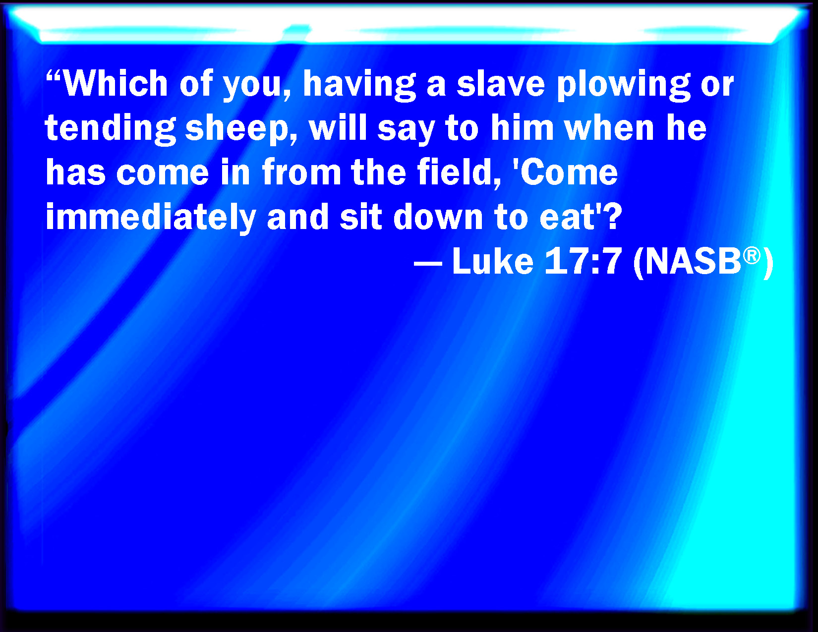 Bible Verse Slide Luke 17:7 But which of you, having a servant plowing or feeding cattle, will say to him by and by, when he is come from the field, Go and sit down to meat? KJV: But which of you, having a servant plowing or feeding cattle, will say unto him by and by, when he is come from the field, Go and sit down to meat? DRB: But which of you having a servant ploughing, or feeding cattle, will say to him, when he is come from the field: Immediately go, sit down to meat: DBT: But which of you is there who, having a bondman ploughing or shepherding, when he comes in out of the field, will say, Come and lie down immediately to table? ERV: But who is there of you, having a servant plowing or keeping sheep, that will say unto him, when he is come in from the field, Come straightway and sit down to meat; WBT: But which of you having a servant plowing, or feeding cattle, will say to him immediately, when he is come from the field, Go and sit down to eat? WEB: But who is there among you, having a servant plowing or keeping sheep, that will say, when he comes in from the field, 'Come immediately and sit down at the table,' YLT: But, who is he of you — having a servant ploughing or feeding — who, to him having come in out of the field, will say, Having come near, recline at meat?Links Luke 17:7 NIV • Luke 17:7 NLT • Luke 17:7 ESV • Luke 17:7 NASB • Luke 17:7 KJV • Luke 17:7 Interlinear • Luke 17:7 Commentaries • Luke 17:7 Parallel Texts • Luke 17:7 Bible Apps • Luke 17:7 Parallel • Bible Hub |