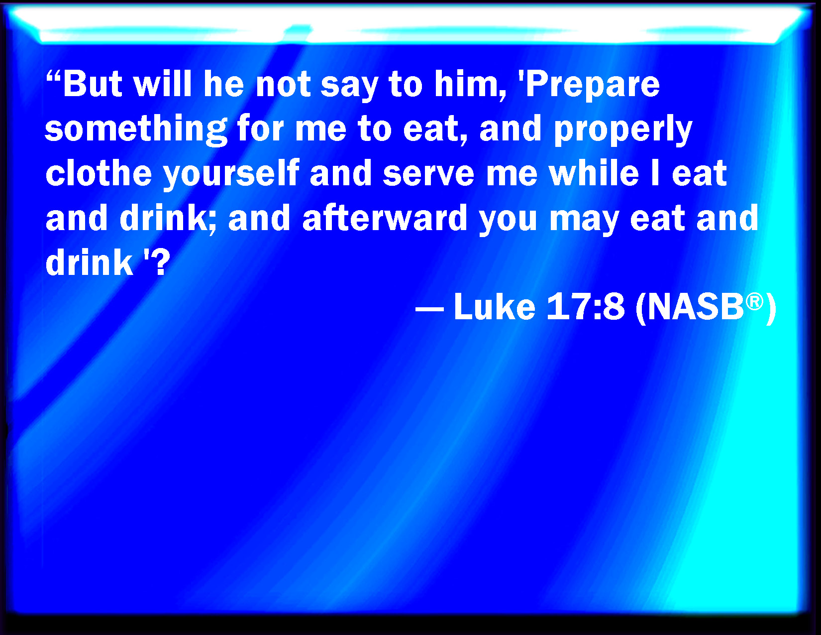 Bible Verse Slide Luke 17:8 And will not rather say to him, Make ready with which I may sup, and gird yourself, and serve me, till I have eaten and drunken; and afterward you shall eat and drink? KJV: And will not rather say unto him, Make ready wherewith I may sup, and gird thyself, and serve me, till I have eaten and drunken; and afterward thou shalt eat and drink? DRB: And will not rather say to him: Make ready my supper, and gird thyself, and serve me, whilst I eat and drink, and afterwards thou shalt eat and drink? DBT: But will he not say to him, Prepare what I shall sup on, and gird thyself and serve me that I may eat and drink; and after that thou shalt eat and drink? ERV: and will not rather say unto him, Make ready wherewith I may sup, and gird thyself, and serve me, till I have eaten and drunken; and afterward thou shalt eat and drink? WBT: And will not rather say to him, Make ready wherewith I may sup, and gird thyself, and serve me, till I have eaten and drank; and afterward thou shalt eat and drink? WEB: and will not rather tell him, 'Prepare my supper, clothe yourself properly, and serve me, while I eat and drink. Afterward you shall eat and drink'? YLT: but will not rather say to him, Prepare what I may sup, and having girded thyself about, minister to me, till I eat and drink, and after these things thou shalt eat and drink?Links Luke 17:8 NIV • Luke 17:8 NLT • Luke 17:8 ESV • Luke 17:8 NASB • Luke 17:8 KJV • Luke 17:8 Interlinear • Luke 17:8 Commentaries • Luke 17:8 Parallel Texts • Luke 17:8 Bible Apps • Luke 17:8 Parallel • Bible Hub |