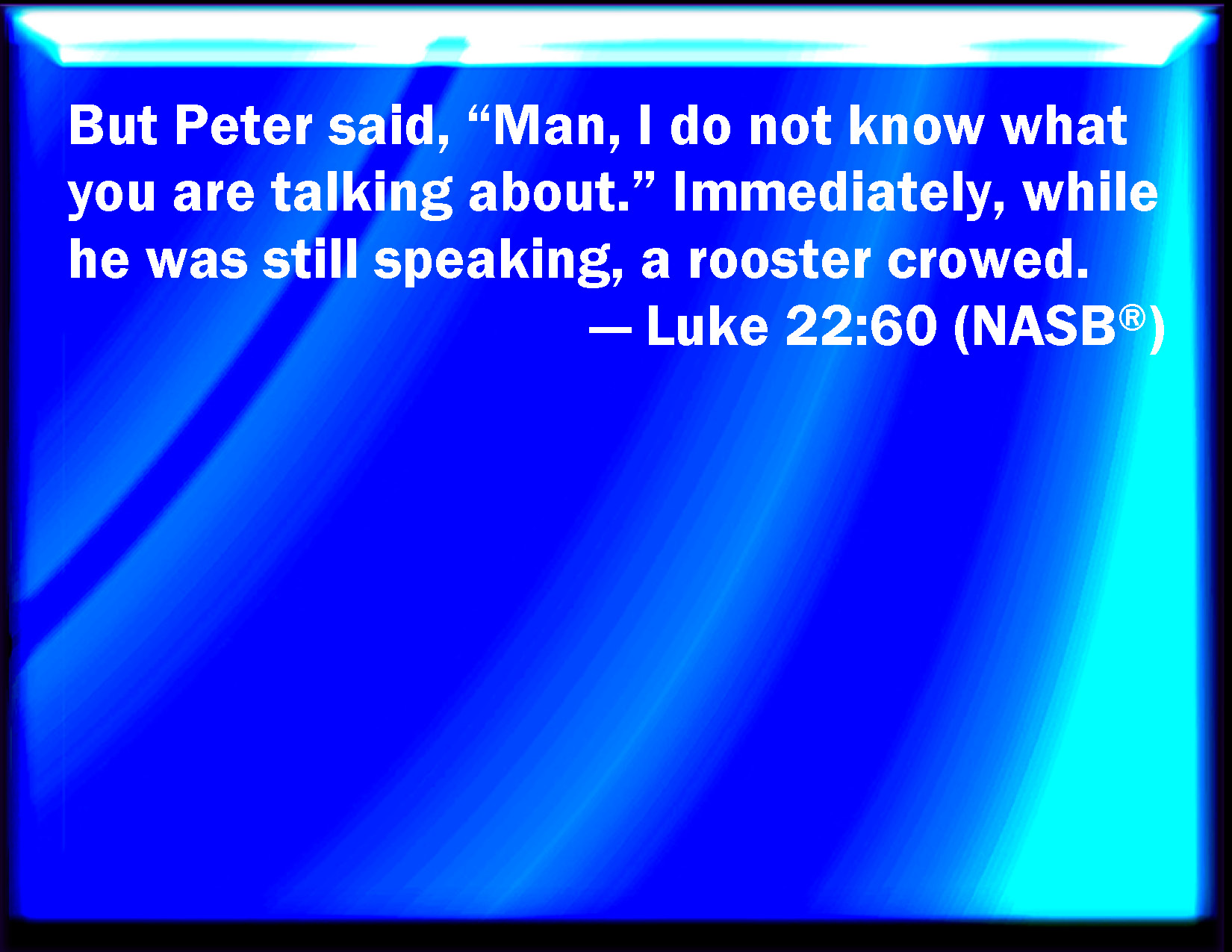 Bible Verse Slide Luke 22:60 And Peter said, Man, I know not what you say. And immediately, while he yet spoke, the cock crew. KJV: And Peter said, Man, I know not what thou sayest. And immediately, while he yet spake, the cock crew. DRB: And Peter said: Man, I know not what thou sayest. And immediately, as he was yet speaking, the cock crew. DBT: And Peter said, Man, I know not what thou sayest. And immediately, while he was yet speaking, the cock crew. ERV: But Peter said, Man, I know not what thou sayest. And immediately, while he yet spake, the cock crew. WBT: And Peter said, Man, I know not what thou sayest. And immediately, while he was yet speaking, the cock crowed. WEB: But Peter said, "Man, I don't know what you are talking about!" Immediately, while he was still speaking, a rooster crowed. YLT: and Peter said, 'Man, I have not known what thou sayest;' and presently, while he is speaking, a cock crew.Links Luke 22:60 NIV • Luke 22:60 NLT • Luke 22:60 ESV • Luke 22:60 NASB • Luke 22:60 KJV • Luke 22:60 Interlinear • Luke 22:60 Commentaries • Luke 22:60 Parallel Texts • Luke 22:60 Bible Apps • Luke 22:60 Parallel • Bible Hub |