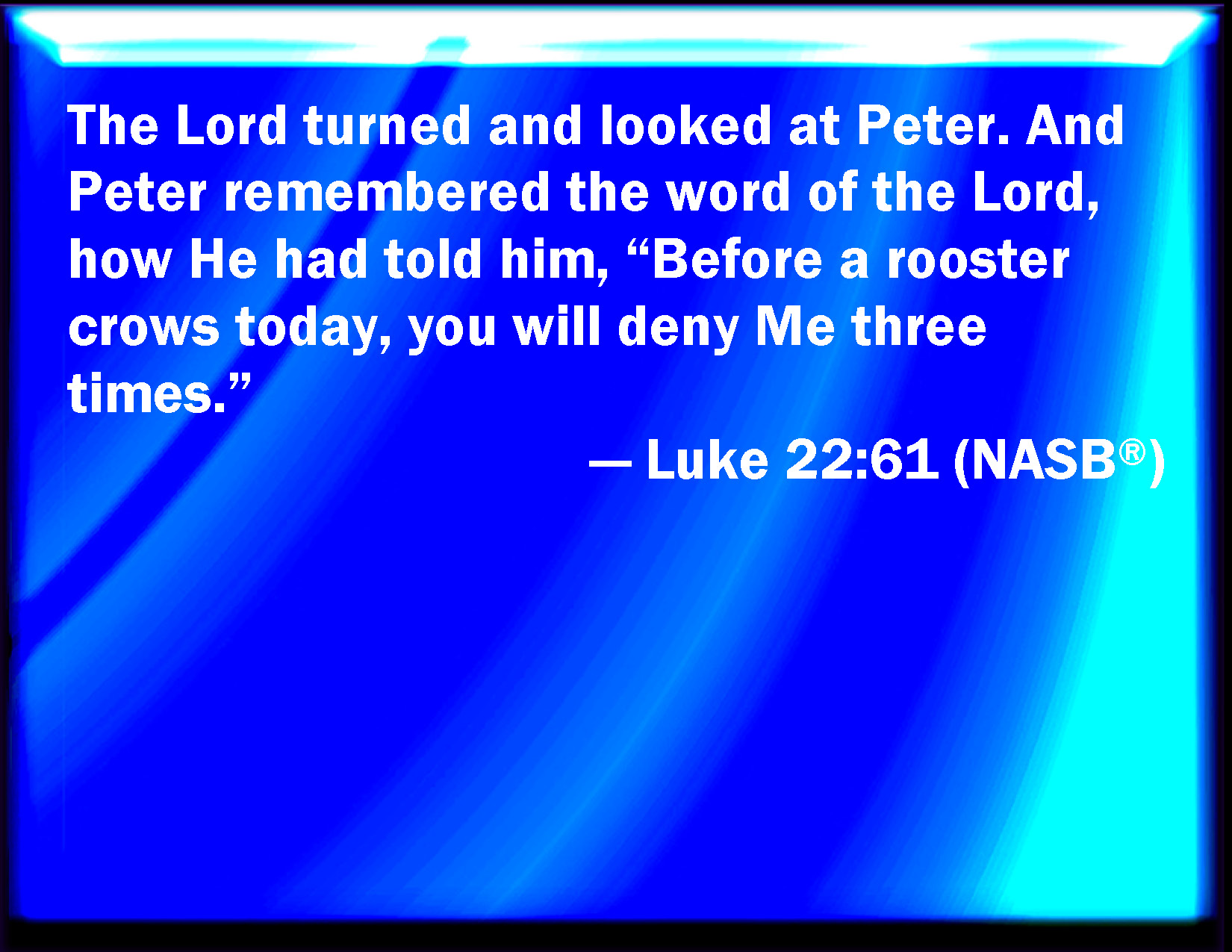 Bible Verse Slide Luke 22:61 And the Lord turned, and looked on Peter. And Peter remembered the word of the Lord, how he had said to him, Before the cock crow, you shall deny me thrice. KJV: And the Lord turned, and looked upon Peter. And Peter remembered the word of the Lord, how he had said unto him, Before the cock crow, thou shalt deny me thrice. DRB: And the Lord turning looked on Peter. And Peter remembered the word of the Lord, as he had said: Before the cock crow, thou shalt deny me thrice. DBT: And the Lord, turning round, looked at Peter; and Peter remembered the word of the Lord, how he said to him, Before the cock crow thou shalt deny me thrice. ERV: And the Lord turned, and looked upon Peter. And Peter remembered the word of the Lord, how that he said unto him, Before the cock crow this day, thou shalt deny me thrice. WBT: And the Lord turned, and looked upon Peter. And Peter remembered the word of the Lord, how he had said to him, Before the cock shall crow, thou wilt deny me thrice. WEB: The Lord turned, and looked at Peter. Then Peter remembered the Lord's word, how he said to him, "Before the rooster crows you will deny me three times." YLT: And the Lord having turned did look on Peter, and Peter remembered the word of the Lord, how he said to him — 'Before a cock shall crow, thou mayest disown me thrice;'Links Luke 22:61 NIV • Luke 22:61 NLT • Luke 22:61 ESV • Luke 22:61 NASB • Luke 22:61 KJV • Luke 22:61 Interlinear • Luke 22:61 Commentaries • Luke 22:61 Parallel Texts • Luke 22:61 Bible Apps • Luke 22:61 Parallel • Bible Hub |