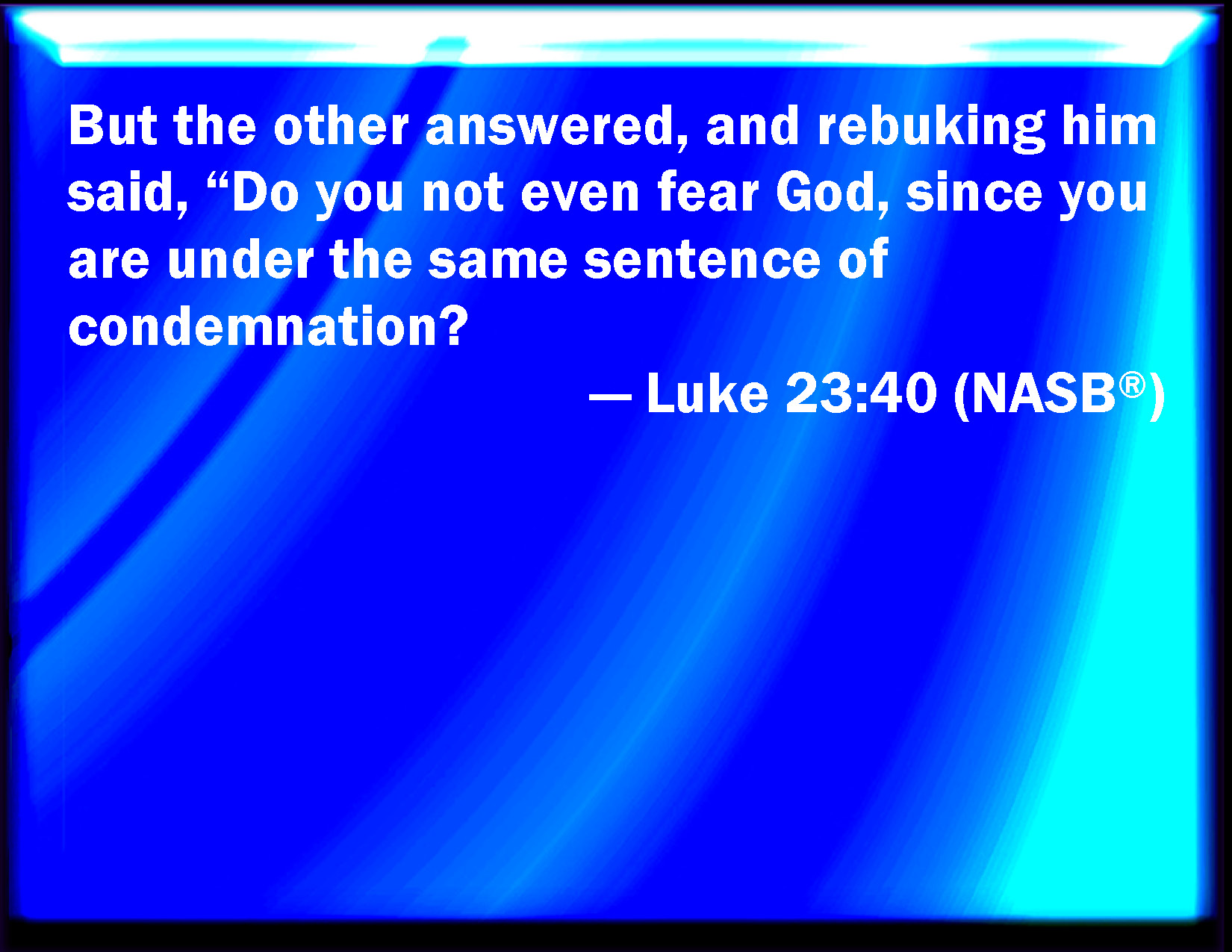Bible Verse Slide Luke 23:40 But the other answering rebuked him, saying, Do not you fear God, seeing you are in the same condemnation? KJV: But the other answering rebuked him, saying, Dost not thou fear God, seeing thou art in the same condemnation? DRB: But the other answering, rebuked him, saying: Neither dost thou fear God, seeing thou art condemned under the same condemnation? DBT: But the other answering rebuked him, saying, Dost thou too not fear God, thou that art under the same judgment? ERV: But the other answered, and rebuking him said, Dost thou not even fear God, seeing thou art in the same condemnation? WBT: But the other answering, rebuked him, saying, Dost not thou fear God, seeing thou art in the same condemnation? WEB: But the other answered, and rebuking him said, "Don't you even fear God, seeing you are under the same condemnation? YLT: And the other answering, was rebuking him, saying, 'Dost thou not even fear God, that thou art in the same judgment?Links Luke 23:40 NIV • Luke 23:40 NLT • Luke 23:40 ESV • Luke 23:40 NASB • Luke 23:40 KJV • Luke 23:40 Interlinear • Luke 23:40 Commentaries • Luke 23:40 Parallel Texts • Luke 23:40 Bible Apps • Luke 23:40 Parallel • Bible Hub |